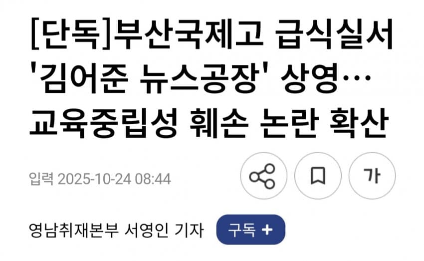 24일 본지 취재 결과 부산국제고는 최근 급식 시간 중 해당 방송을 급식실 내 TV를 통해 상영해온 것으로 알려졌다. 학생과 학부모 일부는 “공교육 현장에서 특정 정치 성향의 콘텐츠를 반복적으로 노출하는 것은 부적절하다”며 교육청의 관리감독을 촉구했다.