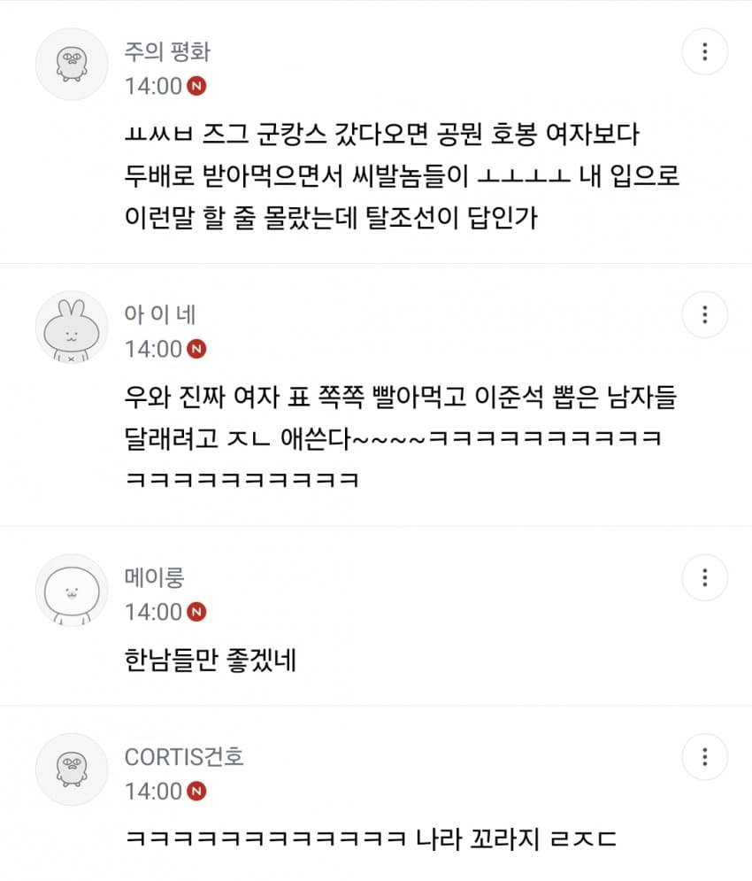 "여자는 무력감을 느끼는 상황, 무력해진 인간을 인지하는 감각이 1순위로 세팅되어 있으며,무력해진 인간은 밟아죽여도 되는 존재라고 느낀다"이 말인즉슨, 남자가 아무리 병역으로 죽거나 불구가 되거나 고달픔을 성토해봤자여자들에게서 들을 수 있는 말은 잔인한 조롱과 야유 뿐이라는것이다.사실 이 정도는 이제 다알지?커뮤니티를 하는여자들은 자신들의 화력, 단결성, 인신공격 스킬 따위를 매우 자랑으로 여긴다.무논리로 상대방 인신공격하고 놀려서 상대방 긁는 것에 대단한 쾌감을 느낀다.애석하게도 현대 민주주의는 이런 방식이 매우 잘 통하기도 한다
