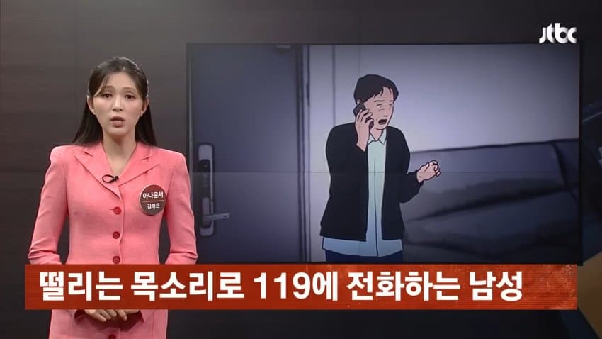 남성 한 명이 떨리는 목소리로 119에 전화를 함