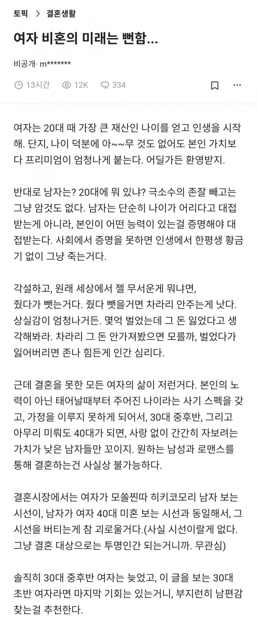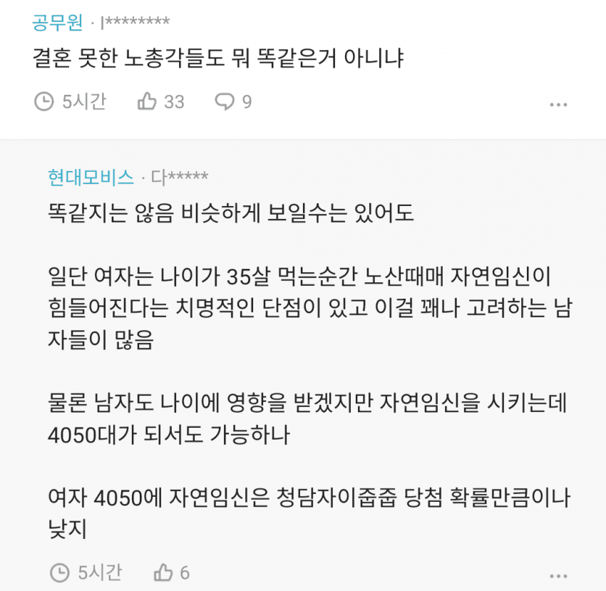 여자는 수명이 한계라 35살 이후론 그냥 늦었든 아니든 중요한게 아니라 아기를 못 낳는다는거에서 폐급이 되는거지딩크할 남자를 구하는것도 ㅈㄴ 어려운데 딩크하면서 본인 기준에 충족할 남자는 더 어렵겠지그럼 자연스레 눈 낮춰서 애 딸린 돌싱남 봐야되는데 돌싱남도 애 낳고 싶어하는 남자는 거르고 만나야 되는데 그러려면예쁘거나 능력이 좀 되어야 하는데 그것도 아니고 그냥 35살부터는 깔끔히 포기할 생각을 갖는게 맞지남자 노총각 여자 노처녀??? 비교 대상이 아님<40중후 남자 노총각+자산 평범(집 없음)+외모 평범 = 35살 여자 노처녀+자산 평범(집 없음)+외모 평범+불임 X>여야 어느정도 공평한 수준임 여자 나이 38살 넘어가면 일반 아이갖고 싶은 40미만 남자는 자동적으로 구할수 없게됨