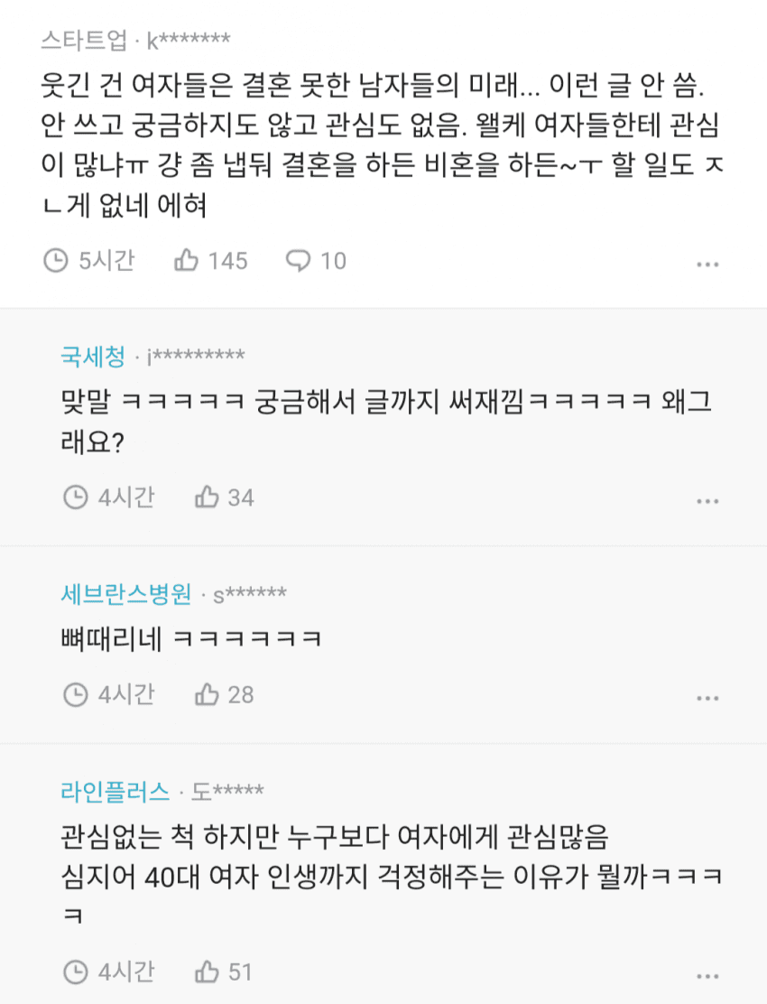 위에서 그 40미혼녀들 세금지원 해달라고 할게 뻔해서 글 쓴다고 적어 놨구만 이악물고 무시하노ㅋㅋ 정신승리가 그리 하고 싶음?