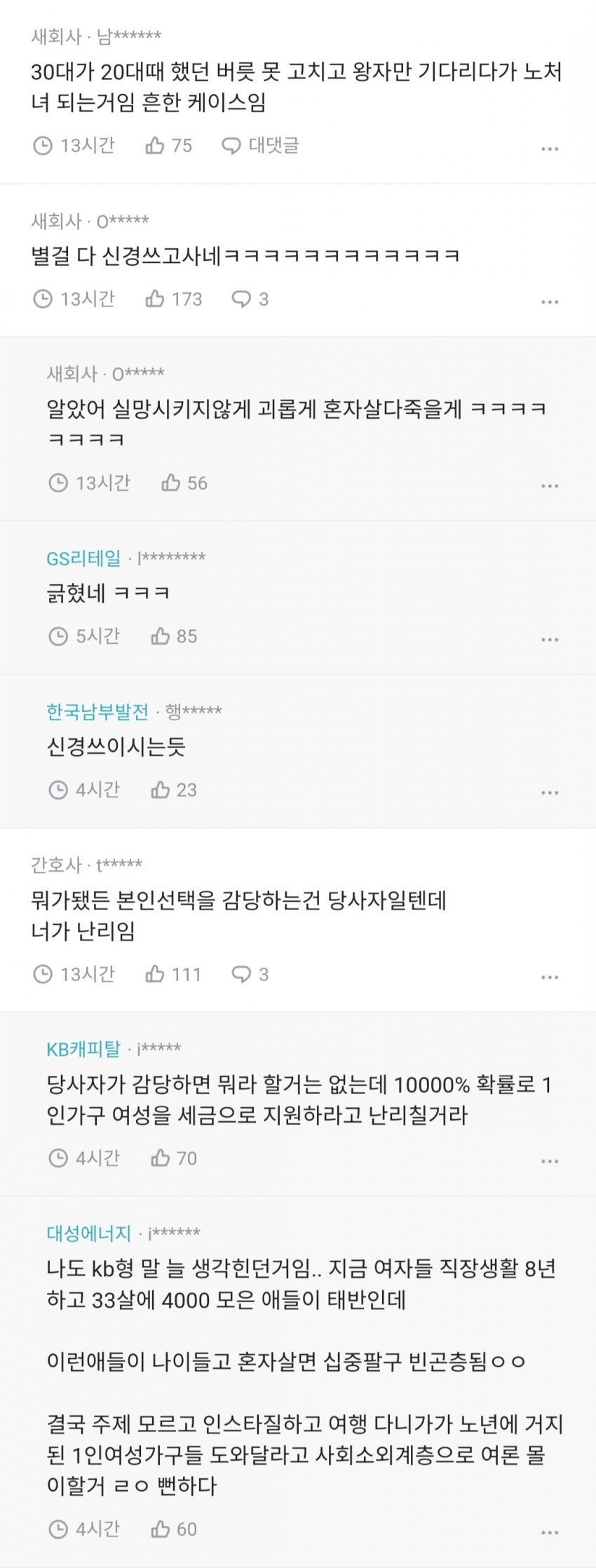 그래도 여자라는 성별이 사기인게 나이 많이 먹어도 취직 자리가 있다는 것임. 입주가정부-베이비시터 가능한 나이가 있고, 더 나이들면 간병인하면서 먹고 살 수 있다. 전부 월급-식사-주거 가 주어지는 직업임. 남자는 50살 넘으면 서울대출신도 재취업이 거의 불가능에 가까움. 어쩔 수 없이 창업시켜버림 당해서 망하는 거고