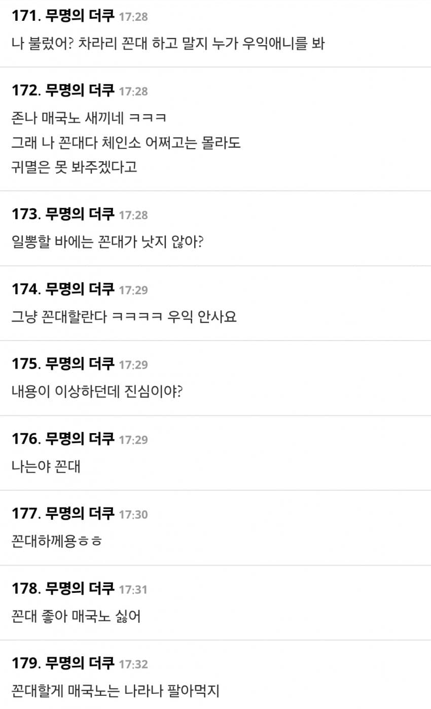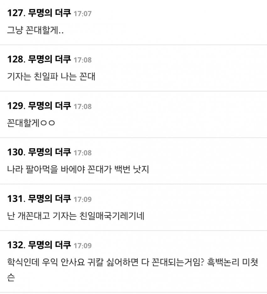 친중할바에야 친일하는게 훨씬 낫지이래서 노인복지를 다 없애야돼 늙으면 쓸모 없는 정도가 아니라자꾸 돌아다니면서 민폐를 끼침
