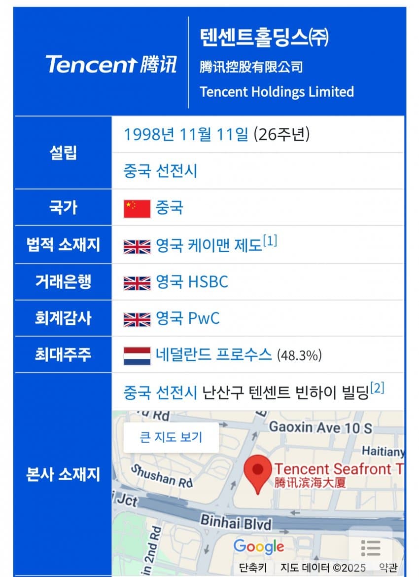 중국에 있는 기업인데도 영국의 섬이 주소로 등록되었음은, 조세 회피처 가능성이 높다는 것. 텐센트가 올해 SM의 2대 대주주가 된 것만 보더라도, 국내 엔터테인먼트 산업을 지네 마음대로 주무르려는 의도가 보여. 네덜란드 대주주 뜻이라기보다는...지금 카카오도 중국인들 지분이 들어갔는데