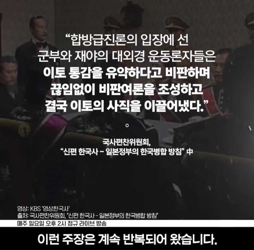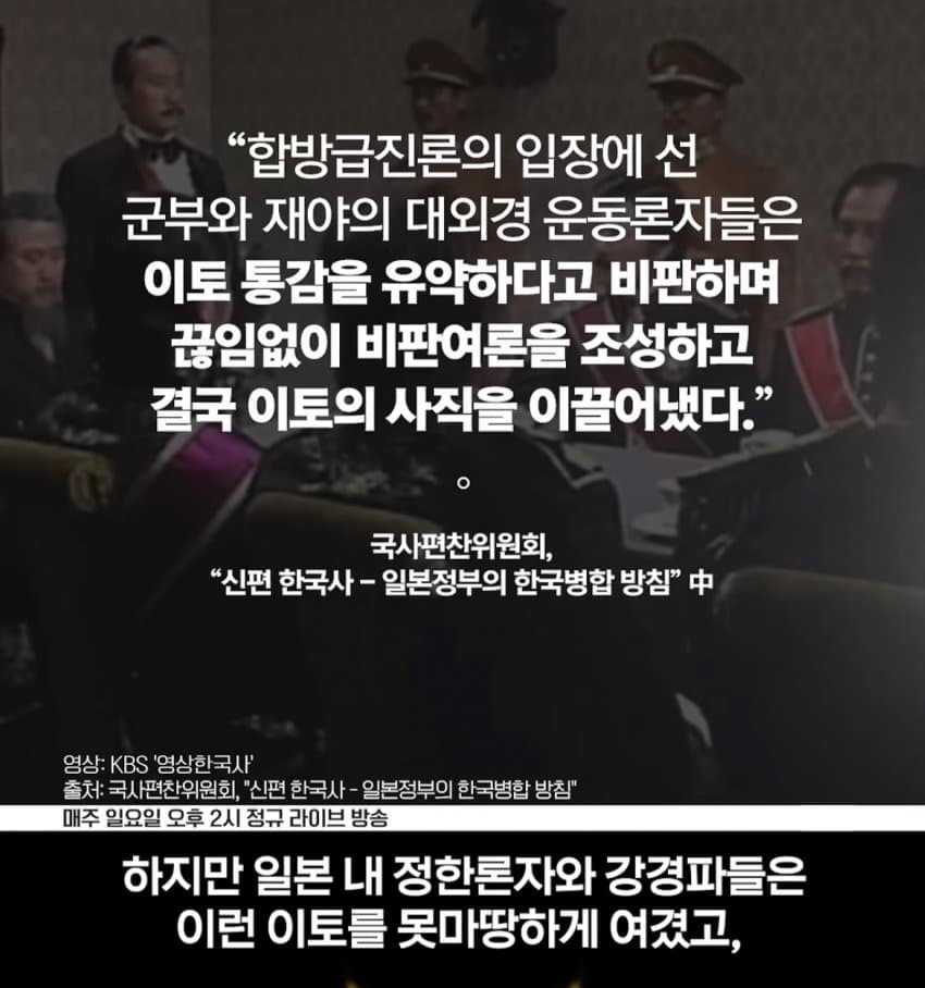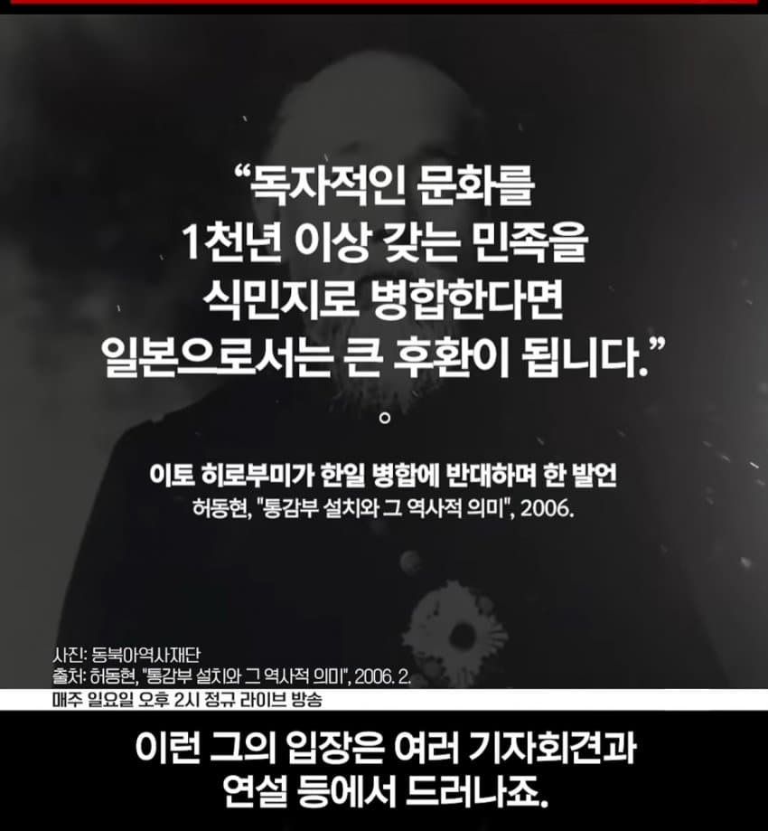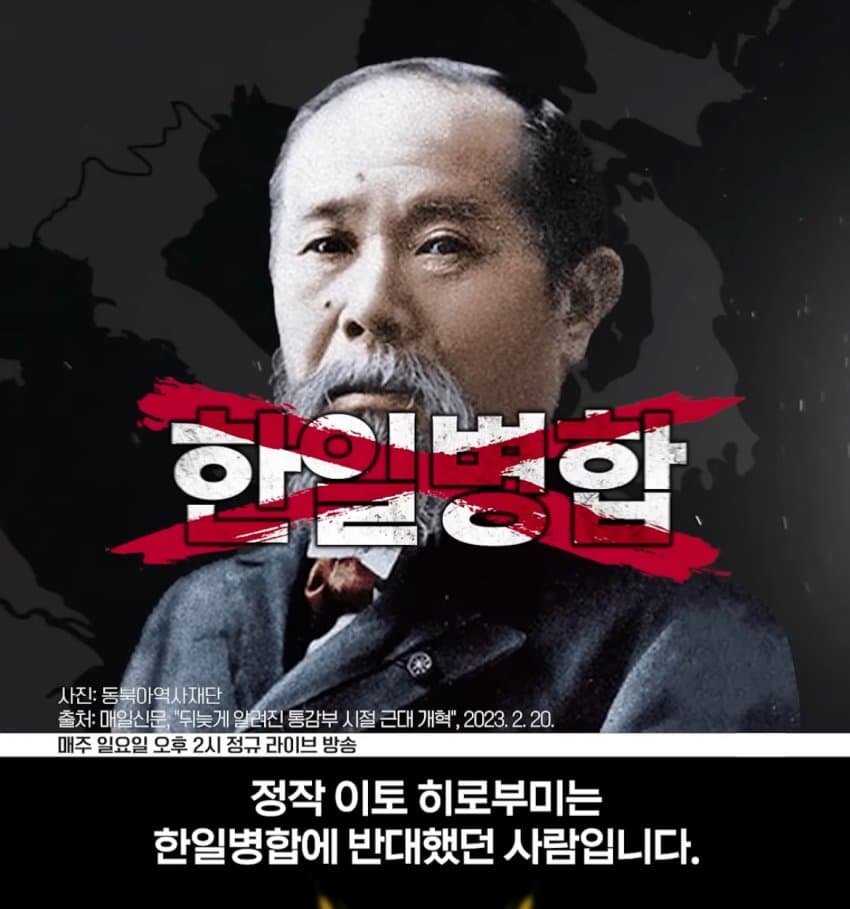 팩트는 이토 히로부미도 한일 병합을 지지했고 오히려 초반부터 문화통치를 주장하는 등 더 교활한 방식으로 융화 계획을 추진하고 있었다는거임이토 히로부미가 나쁜놈이 아니어야 일본의 한일병합 책임소재가 면책된다고 생각하는 한 원종이의 선동 똥글 개소리가 인터넷과 숏츠로 확산된 케이스