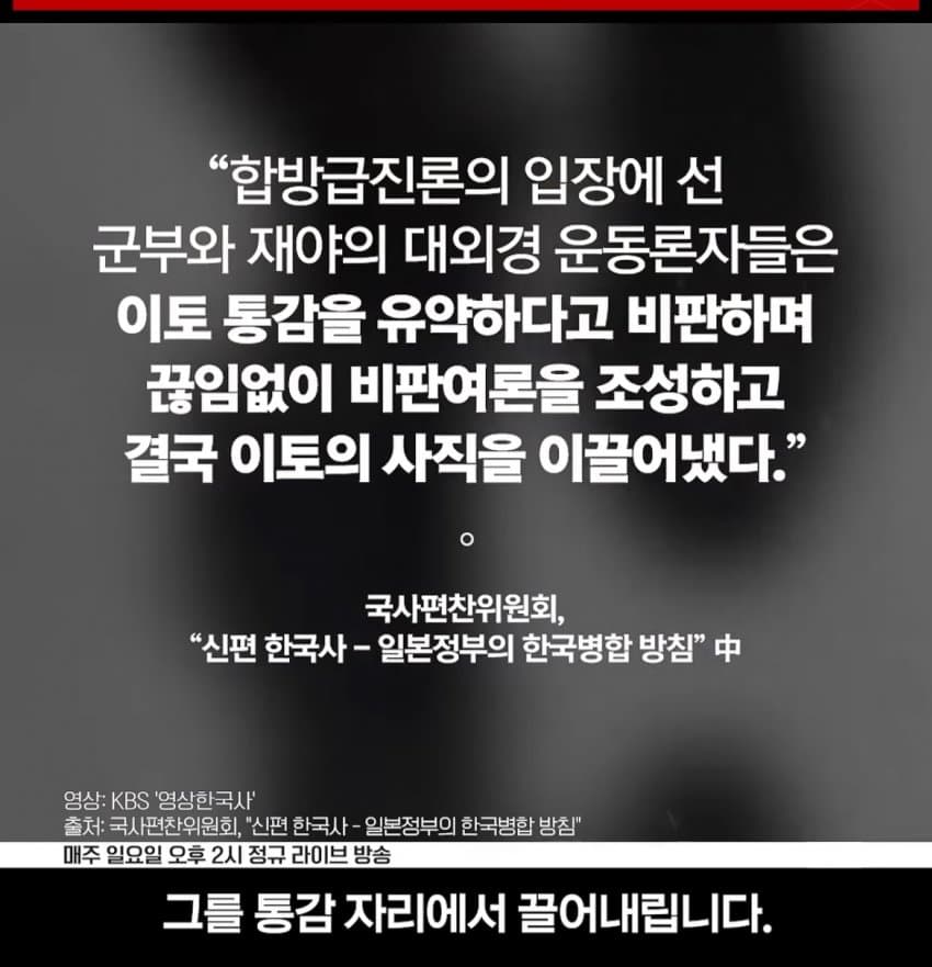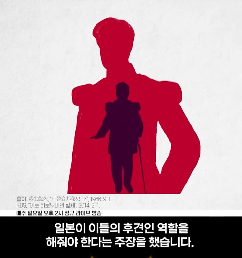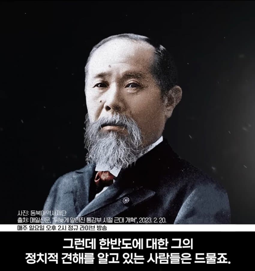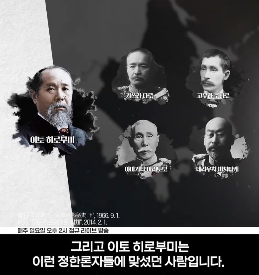 실제로 이토히로부미가 남좋은일 시킬거 같냐 통치방식이 다른거야 정한론자들은 병합이고 이토같은 부류들은 식민지화해서 철저하게 뺏어먹는 더 악랄한거고, 이토가 원한건 대영제국의 식민지 경영인거임 아직도 영국인들은 인도보고 우리 대영제국이 인도를 발전시켰다고 믿고 있음 신사적으로 병합하지도 않고 똑같이 착취할수있는 국제사회에 지탄없는 대의명분도 있는 그런걸 원한거지 무슨 조선을 도와 돕기는 안중근이 그런사람 처단한거고, 그런 안중근을 까는방법이 테러리스트로 둔갑하는 방법이 저런 방법임 이토->조선을 위한 일본의 천사 안중근->테러리스트 제발 좀 생각하고 살자 친일파를 처단했어야하는데 이승만진짜