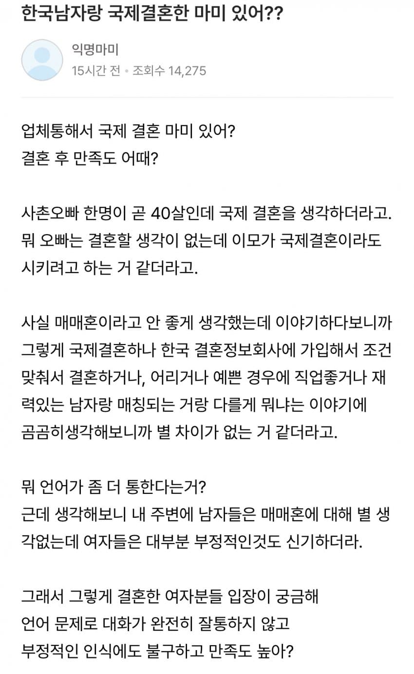 대충 40대 장가못간 사촌오빠 이모가 국결시킨다는 글