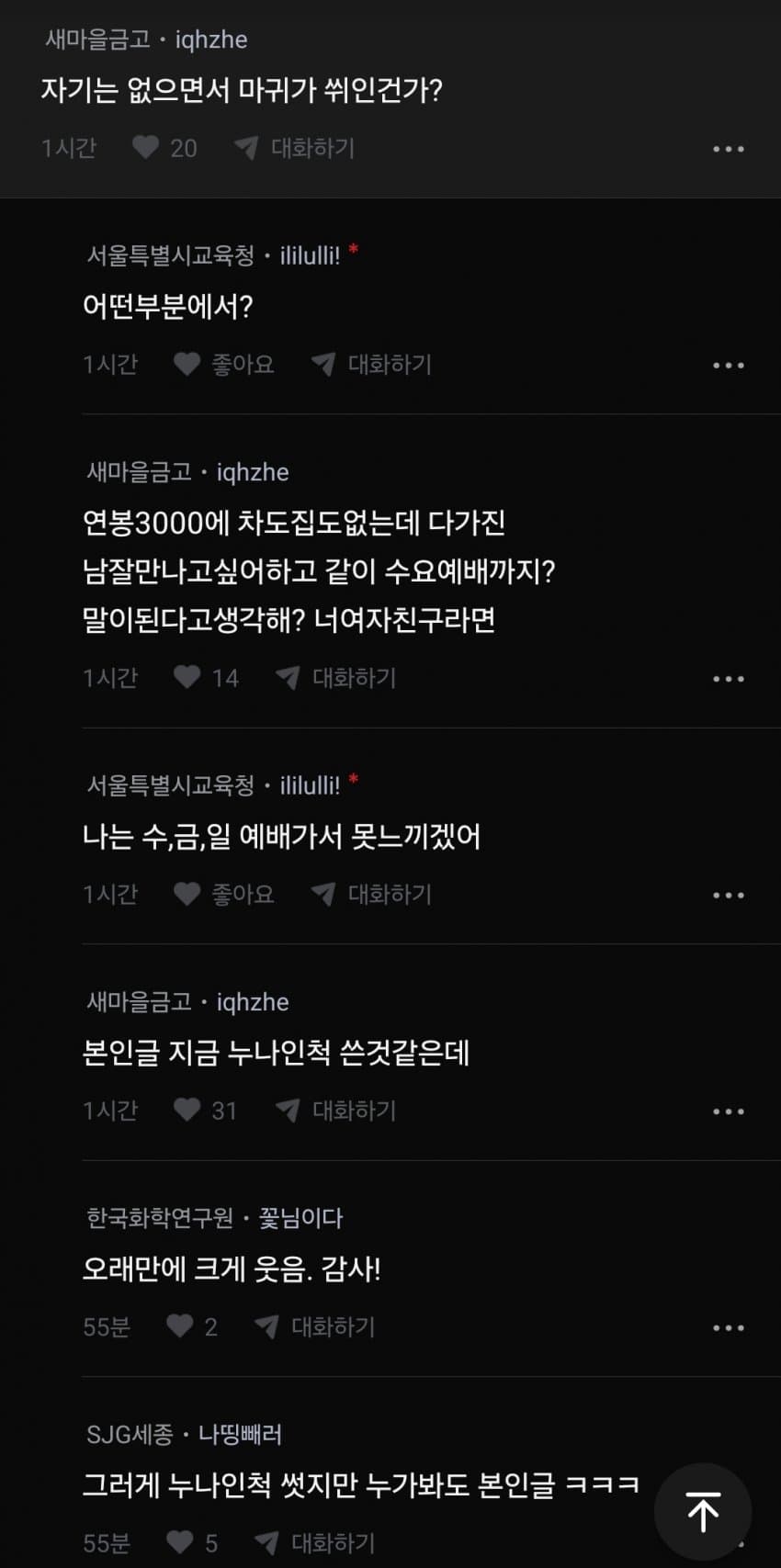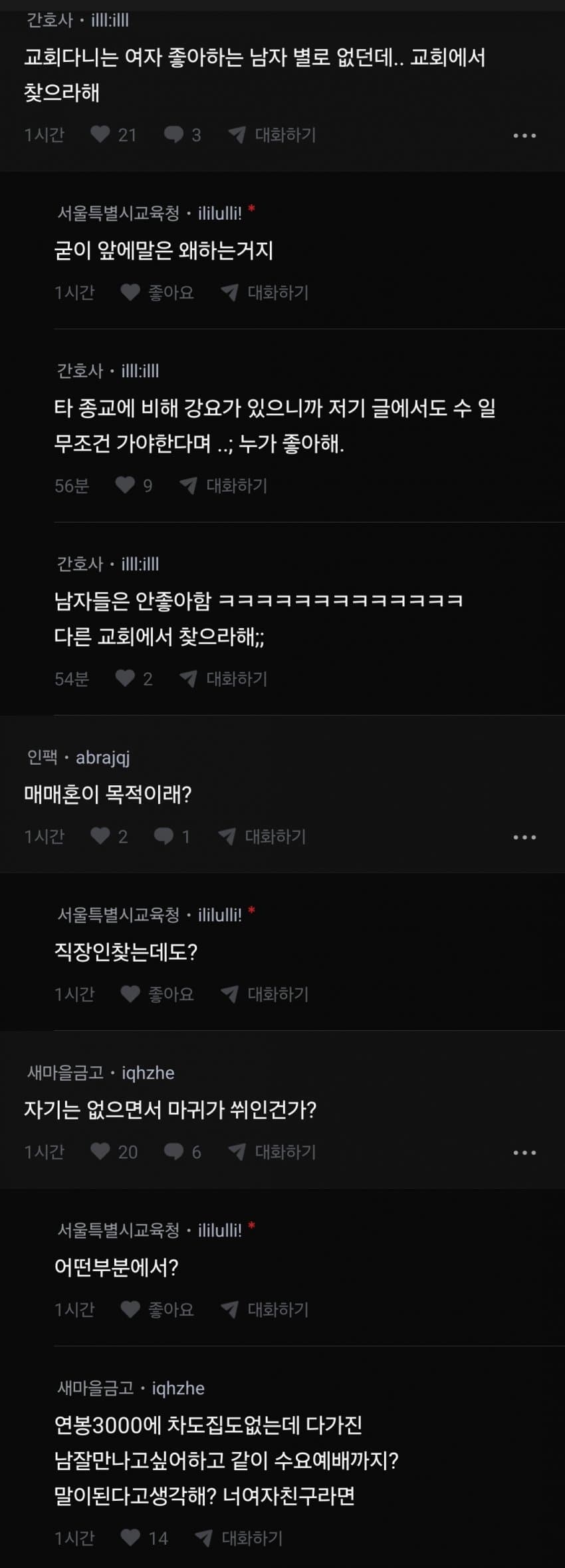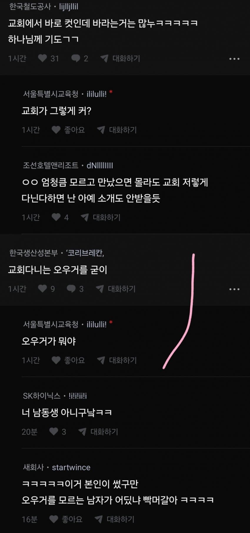 수요일 새벽에 통성기도해야되서 그럼 꿸뤯뤻뤯거리고 울고 웃고 미친 굿판이 따로 없는데 이게 카타르시스가 어마어마해서 일주일 내내 통성기도만 기다리면서 산다