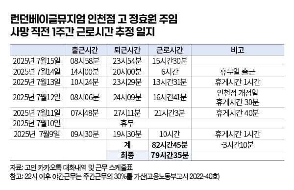 고인이 입사한 지 14개월 만이었다. 스케줄표와 카카오톡 대화내역으로 추정한 결과 고인은 사망 직전 1주 동안 80시간 일했다. 숨지기 나흘 전인 7월12일 인천점이 새로 문을 열며 하루 평균 13시간 일했고 휴무일에도 동원됐다. 사망 직전 2~12주까지는 한 주 평균 58시간을 일한 것으로 확인되는 등 만성적 과로에 시달렸다. 고인은 퇴근 뒤에도 집에서 서류 업무를 하거나 휴무일에도 카페에서 일하는 등 혼자서 소화하기 어려운 양의 일을 감당했다. 이런 시간을 포함하면 실 근로시간은 더 늘어날 가능성이 높다.