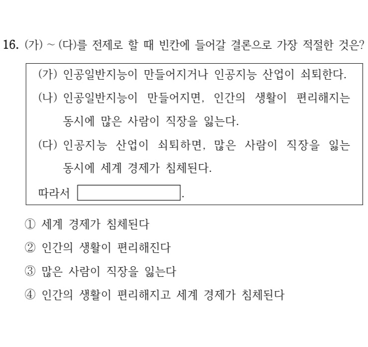 LEET나 PSAT 순한 버전이네. 저건 문장을 이해해서 푸는 게 아니라 술어논리를 공부해야 되는거야
