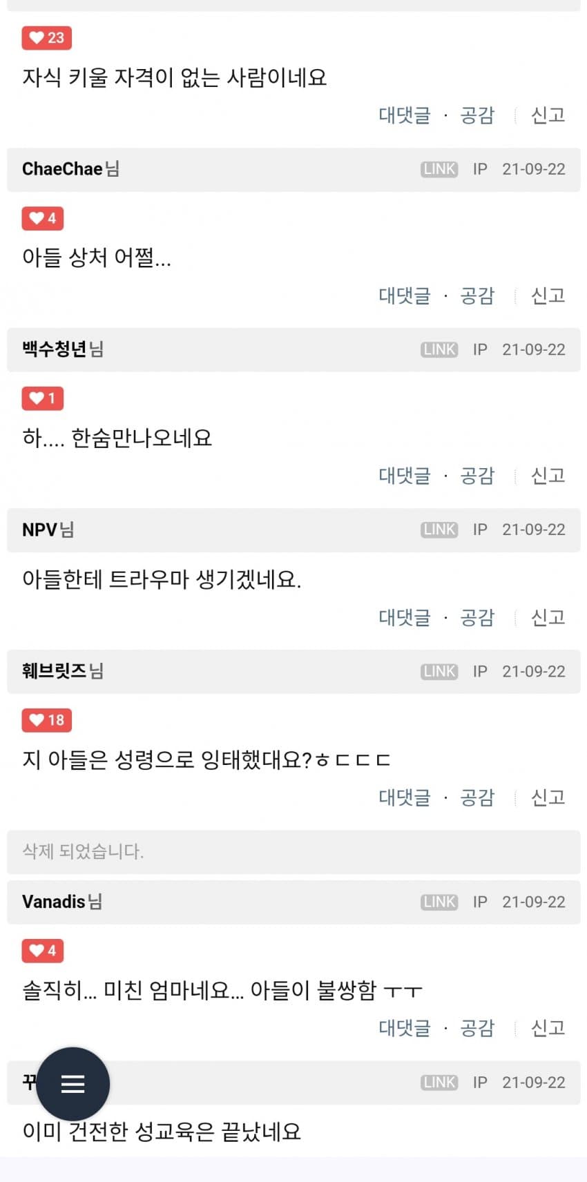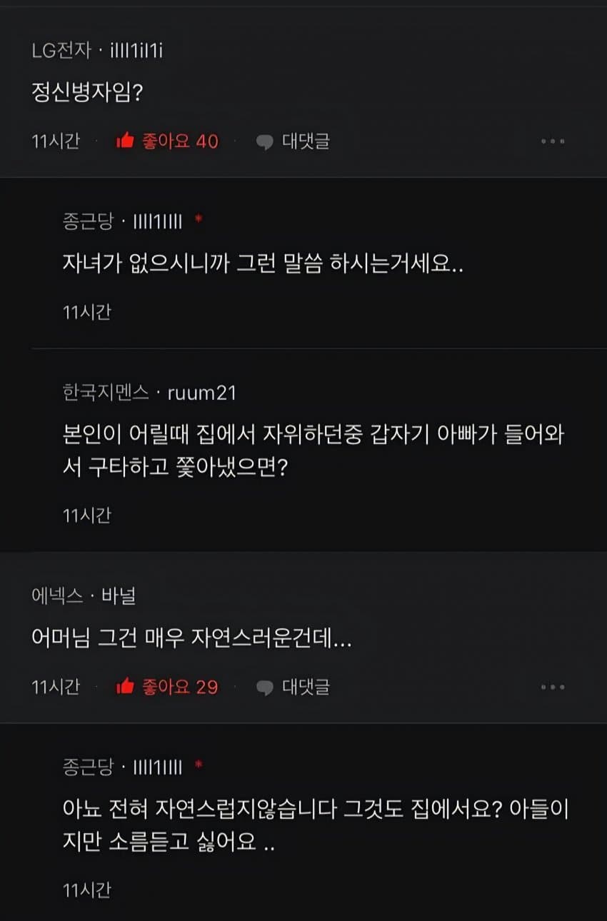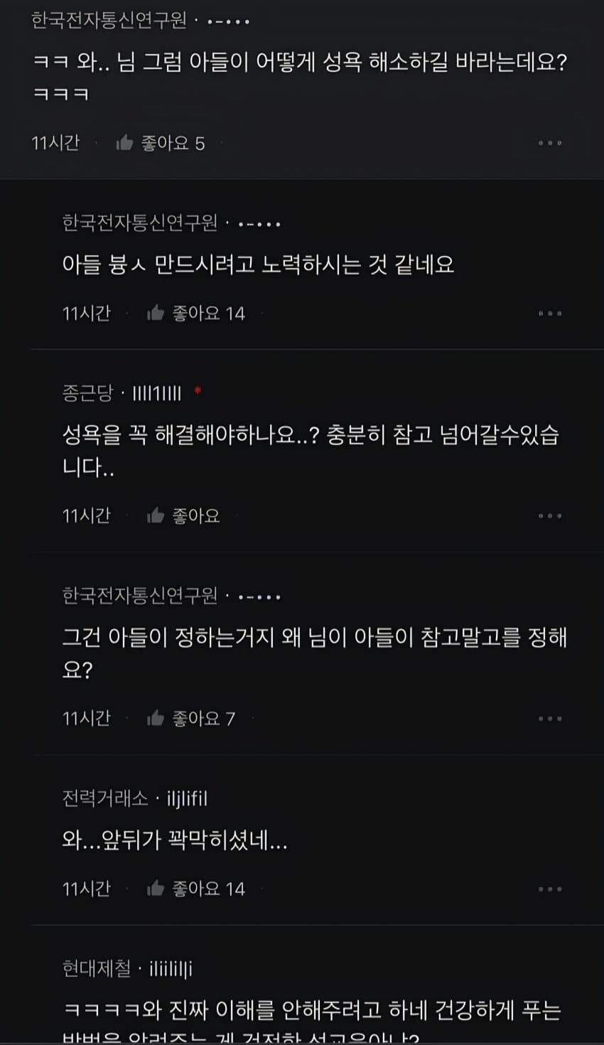 포도당좌 현답이네ㅋㅋㅋㅋㅋ식탐좌도 가까이서 보면 토나올 정도로 불쾌한데, 식욕도 한번 참아보시지?본인은 성욕이 없거나, 있어도 참을 수 있는데, 남편 때문에 "일부러 안 참아준" 거야?말이 되는 소리를 해야지 원게다가 모니터를 부순 시점에서 이미 그대의 머리 속에는 성인물에 대한 근거없는 혐오만 가득했을 뿐, 교육의 의지는 1도 없었던 거라고.지금이야 폭력에 굴복하겠지만, 나중에 성인이 되고 호르몬 식은 다음에 다시 성인물을 보게 되면"이게 뭐 대단한 거라고 엄마가 그리 발광했던 거지?" 라는 생각이 들 텐데그게 교육? 풉