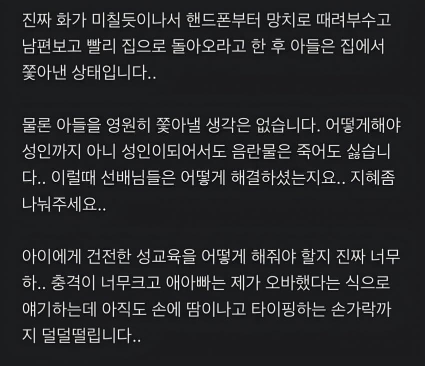 그러니까 왜 화가 나는건데? 옛날 시대의 부모들도 아들이 엇나갈까봐 자신이 부끄러워서 약간 혼을 내긴 해도무슨 범죄 저지른것도 아닌데 왜 저렇게까지 화를 내는거임? ㅋㅋ ㅈㄴ 미친년 아니냐 ㅋㅋ최소한 능지가 높지 않아서 건전한 성문화나 교육 같은거 못할거면 조언 정도만 하면 되지 저렇게 화내는년은 첨 보네 ㄷㄷ아마 저 글쓰기 직전부터 왜 화냈는지 곰곰히 생각해봐도 이유를 모르고 ㅈㄴ 부끄러울듯 ㅋㅋ나쁜 애들과 어울려서 몰래 ㅅㅅ한것도 아니고 꼭 저능지에 못난 부모들은 자기 기준에 안맞으면 다 나쁜 짓이라 우김