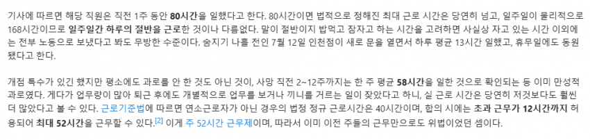한 주 80시간은 할 수 있다. 근데 연이어 계속 평균 60시간은 안되는 거다. 솔직히 한 번 80시간 뛰었다고 젊은 사람이 죽으면 다른 이유가 있을 수도 있다고 생각했는데 전혀 아니네