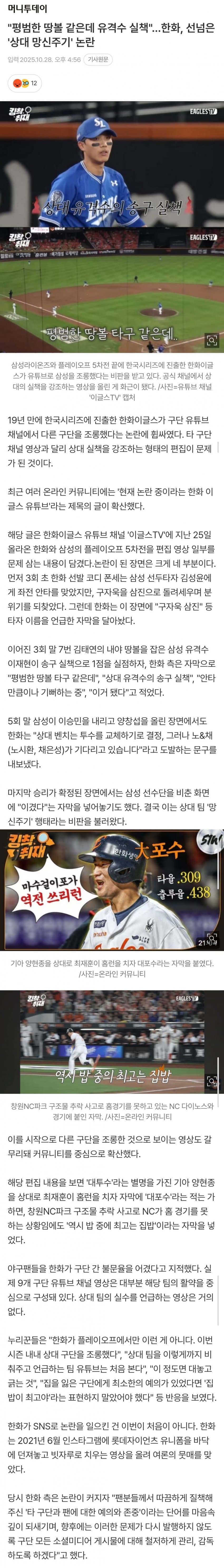 한화 상대 망신주기 논란 기사도 떴네..