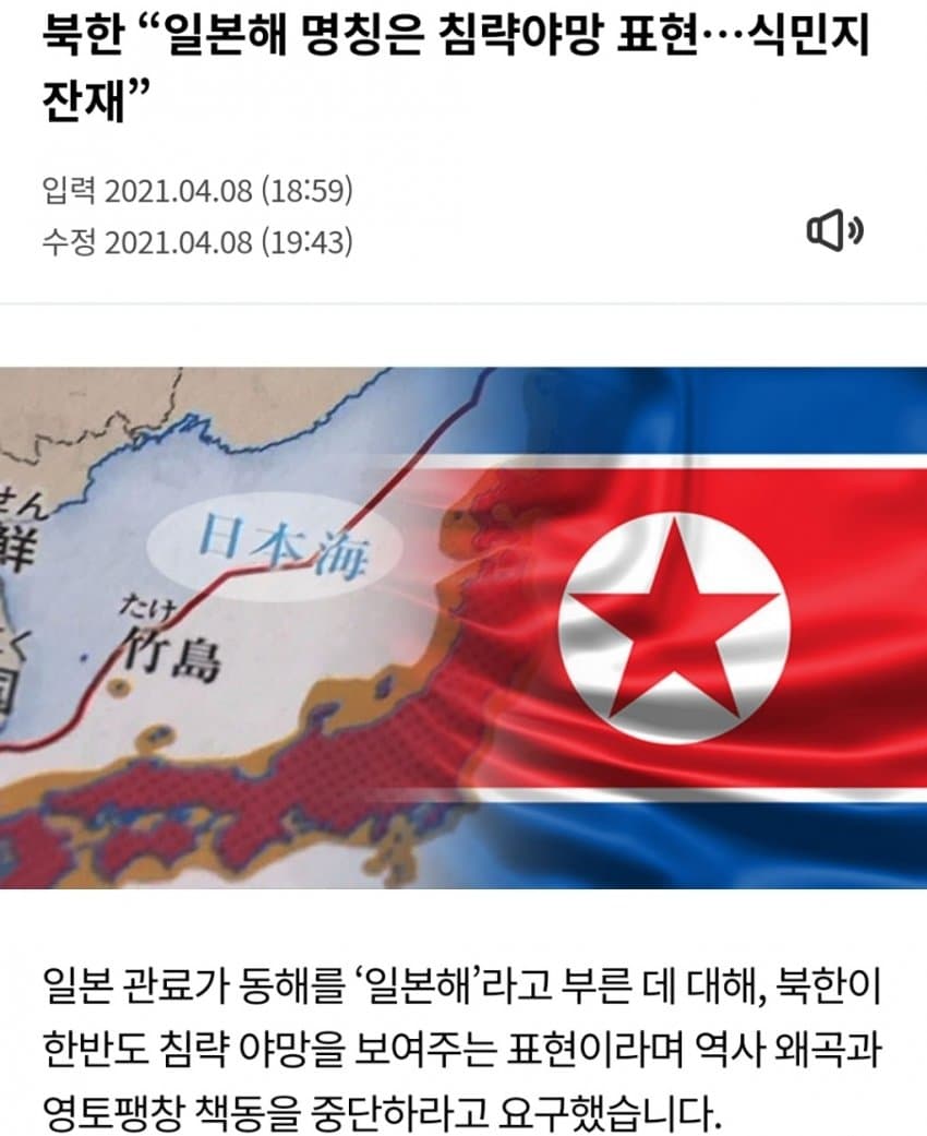 일본해가 18세기 말 19세기 초 유럽에서 먼저 확립되어 200년간 안정적으로 사용되고 있던걸 1992년 한국 북한은 돌연 호칭변경을 제기하였고 20세기 초반 일본의 확장주의, 식민지주의의 결과이므로 동해로 개칭하거나 병기해야한다는 것입니다 그.. 조선 식민지와는 아무 관계도 없는데 한참 후에 국제회의에서 저렇게 주장한 것부터 얼척이없노