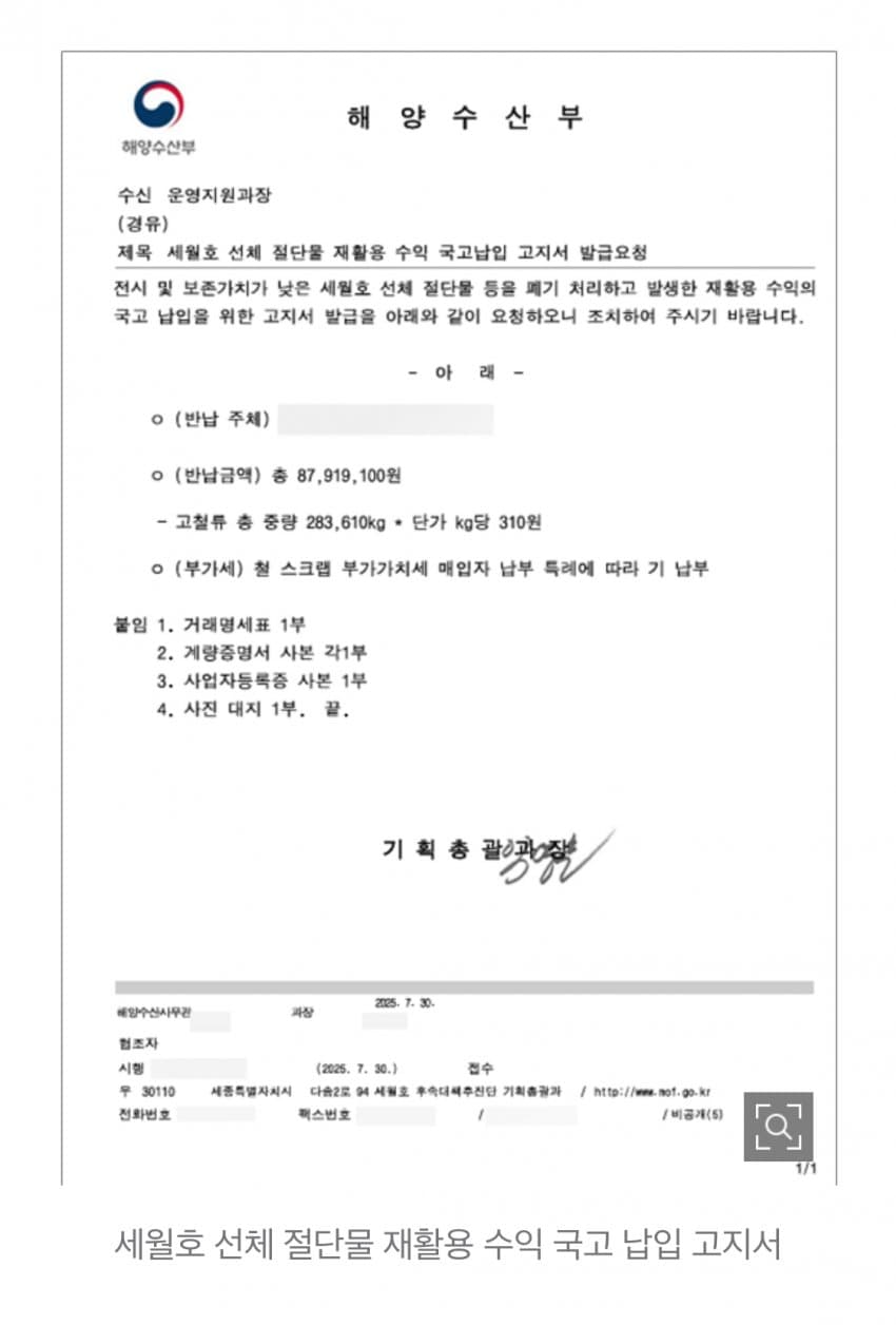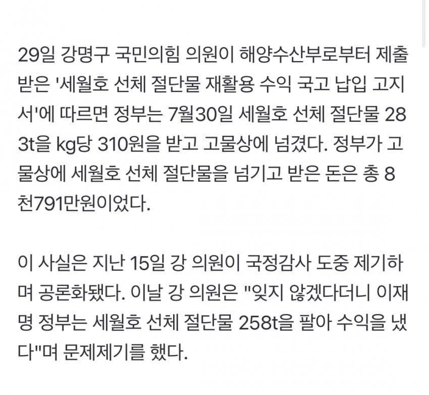 막말로 8천만원이면 국가 입장에서 간에 기별도 안가는 돈인데도 아나바다 운동 티끌모아 태산 IMF 금모으기 운동 맹키로 몰래 선체 뜯어다가 판매한다는게 진짜 어이없노 ㅋㅋㅋㅋㅋㅋㅋ