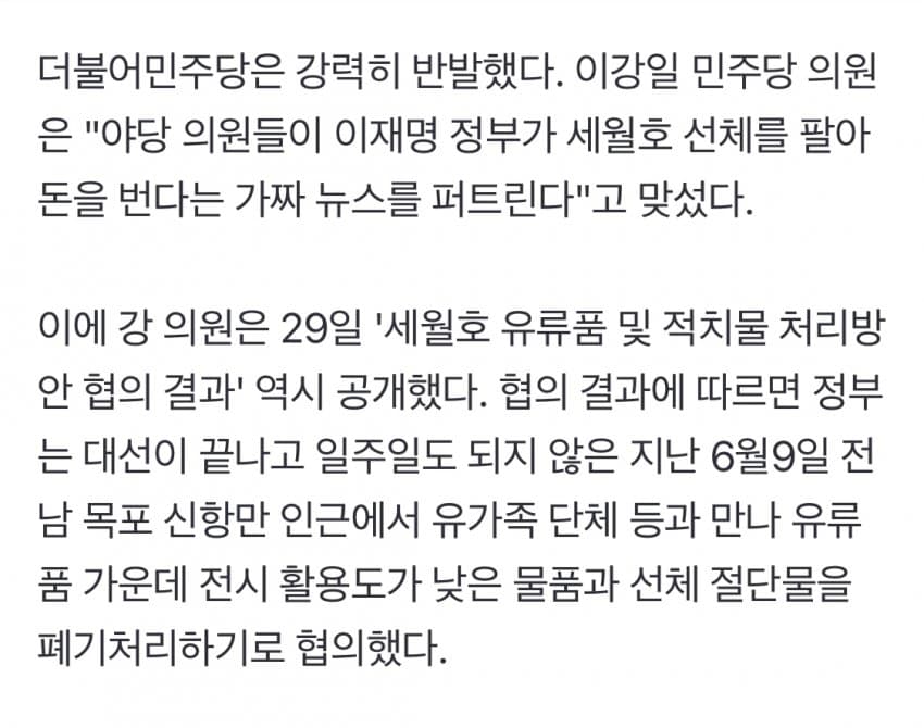 세월호, ㎏당 310원에 고물상 넘어가…민주 "가짜뉴스"