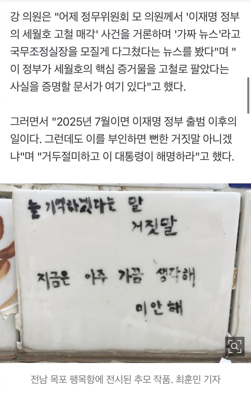 그럼 뭐 세월호 박물관이라도 만들까? 관세협상도 성공했고 여당애들 일잘하는데 국짐은 초치는짓좀 그만해라