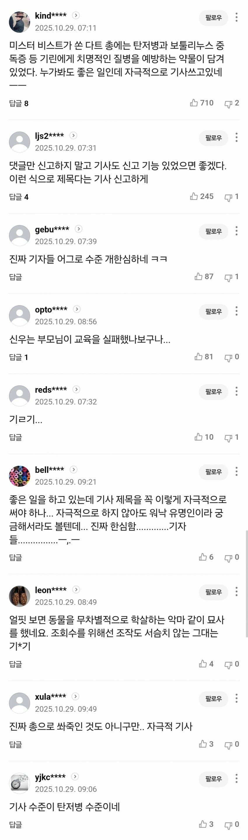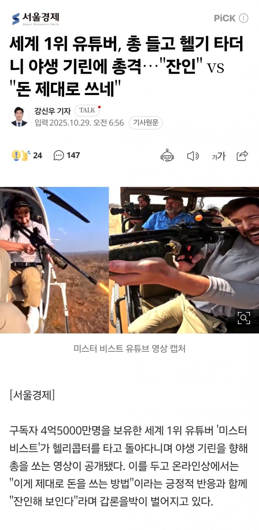 ㅋㅋ 진짜 웃긴게 미스터비스트 가 총쏘는걸로 어그로 끄는건 착한 어그로지만 유튜버가 한 어그로 그대로 받아적으면 욕은 개먹는다는거 ㅋㅋ
