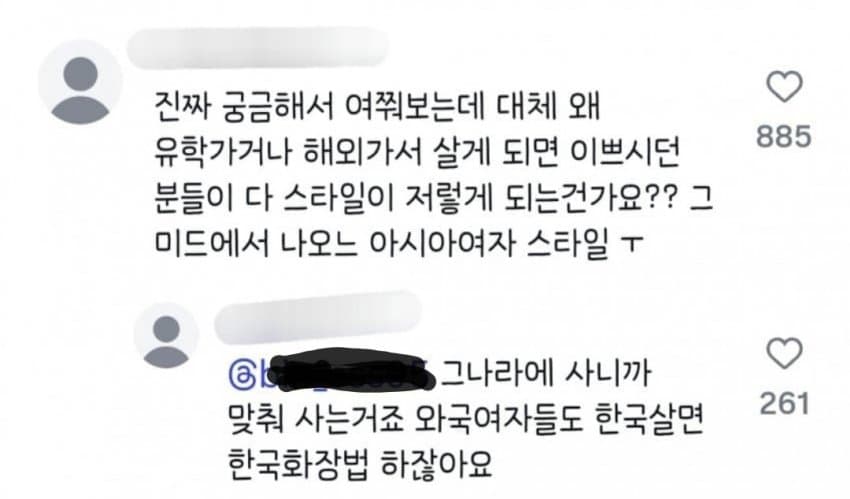 ㅈㄴ웃기는건 정작 미국1.5세대급은 방학때 한국와서 화장품 의류 겁나 챙긴다는거한국스타일이 본인에게 딱 맞거든 특히 의류핏