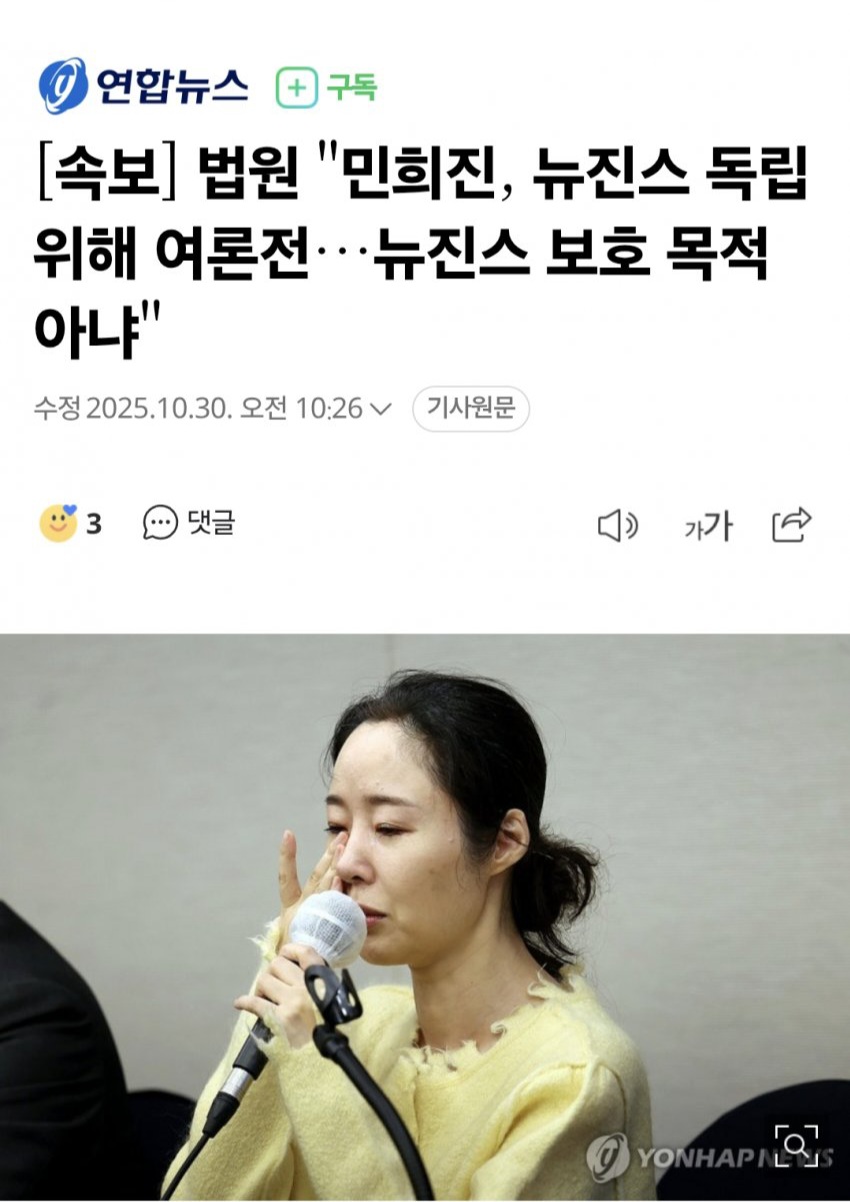 아직도 기사 제목을 실질문맹 이용해서 말장난하네 ; 난 민희진 재판결과 인줄. 민희진 짤랐다고 뉴진스에 대한 계약 불이행이라는게 웃기긴하지. 제목은 뉴진스 전속계약 파기 패소라고 적으면 된다