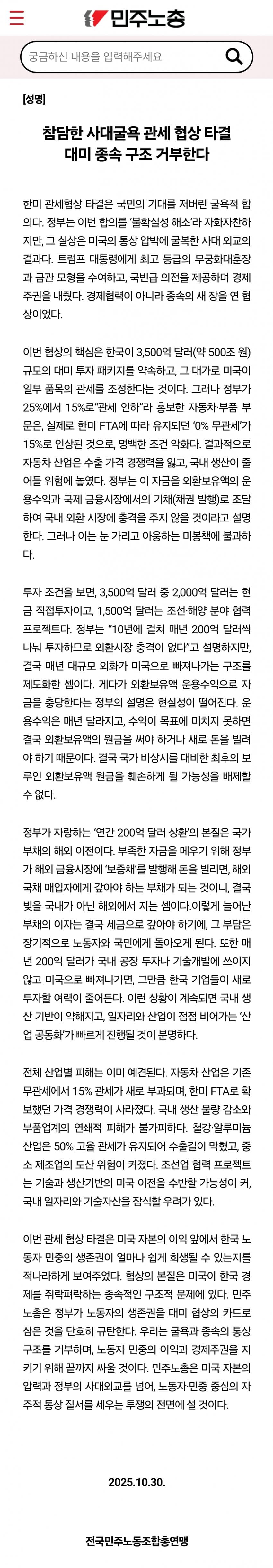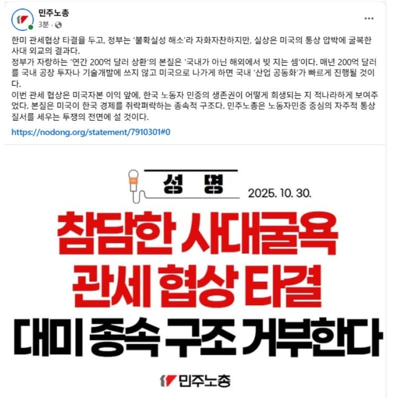 본인 생각은 이런 액션마저 정부랑 얘기된거 같다 이거야. 마치 이재명이 진짜 미국이랑 협상을 잘해서 우파쪽에도 성과있다 이렇게 보여주는거지. 민노총이 반대하면서 그림만들고