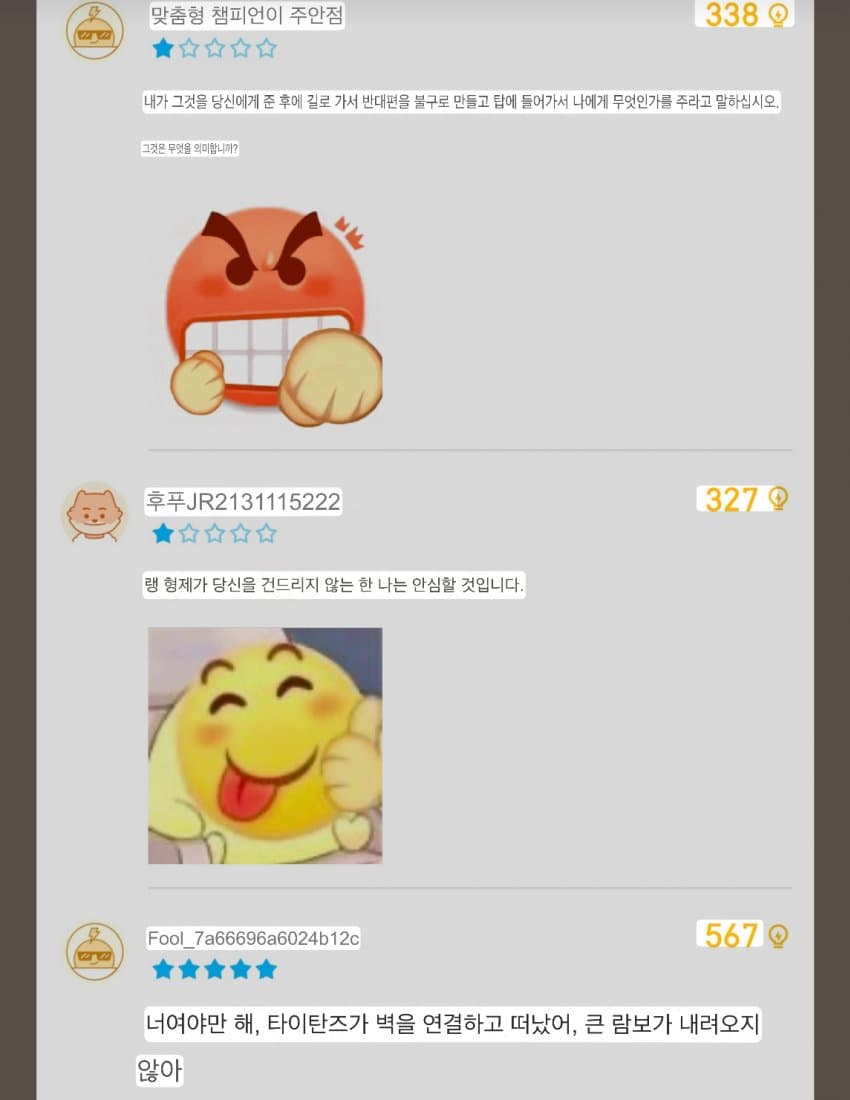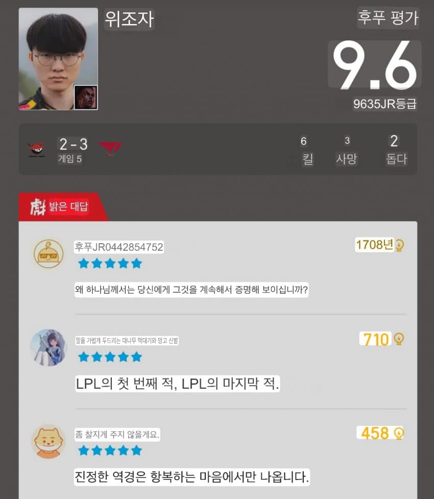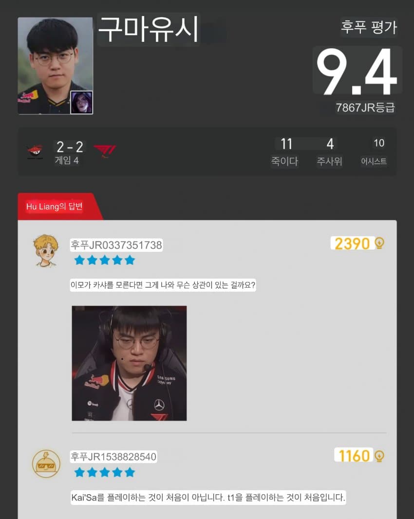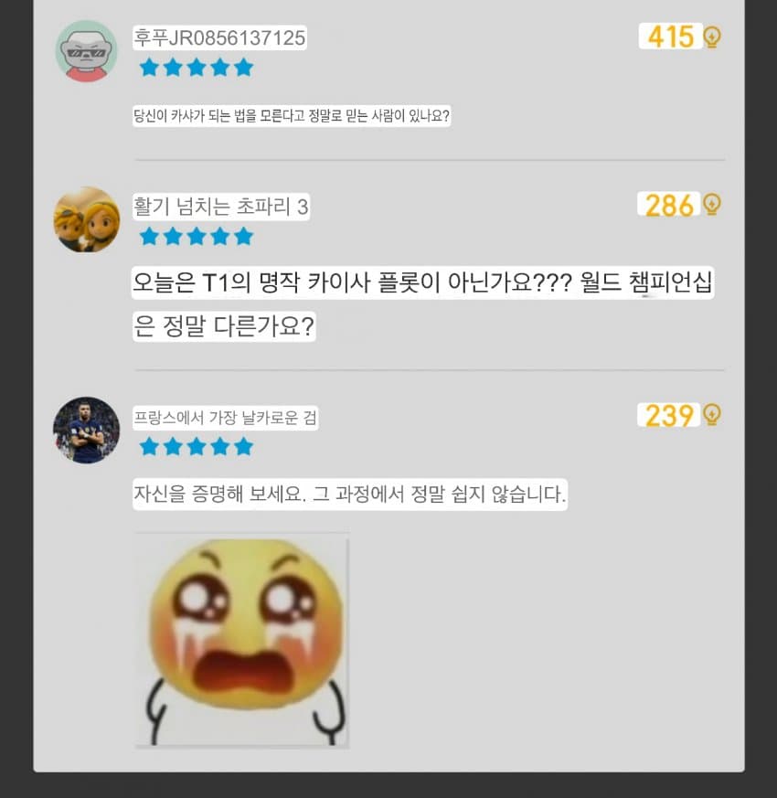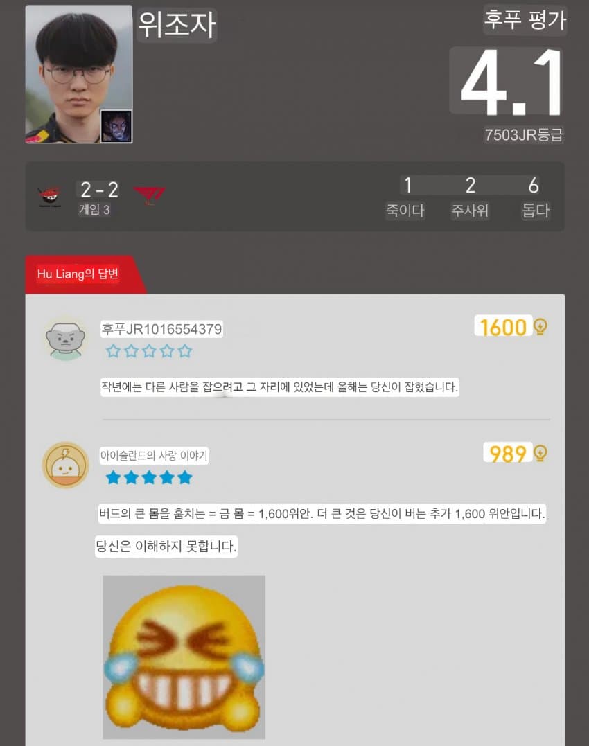 개븅신년: 물물물쮀쮀 ㅋㅋㅋㅋ현실 -> 제우스는 페이커 없으니 8강딱개븅신년: 쵸비가 고트지 ㅋㅋㅋ도란 달고 4강 가봐현실 -> 도란이랑도 바로 월즈 4강IQ 155: X888룰8낀낀
