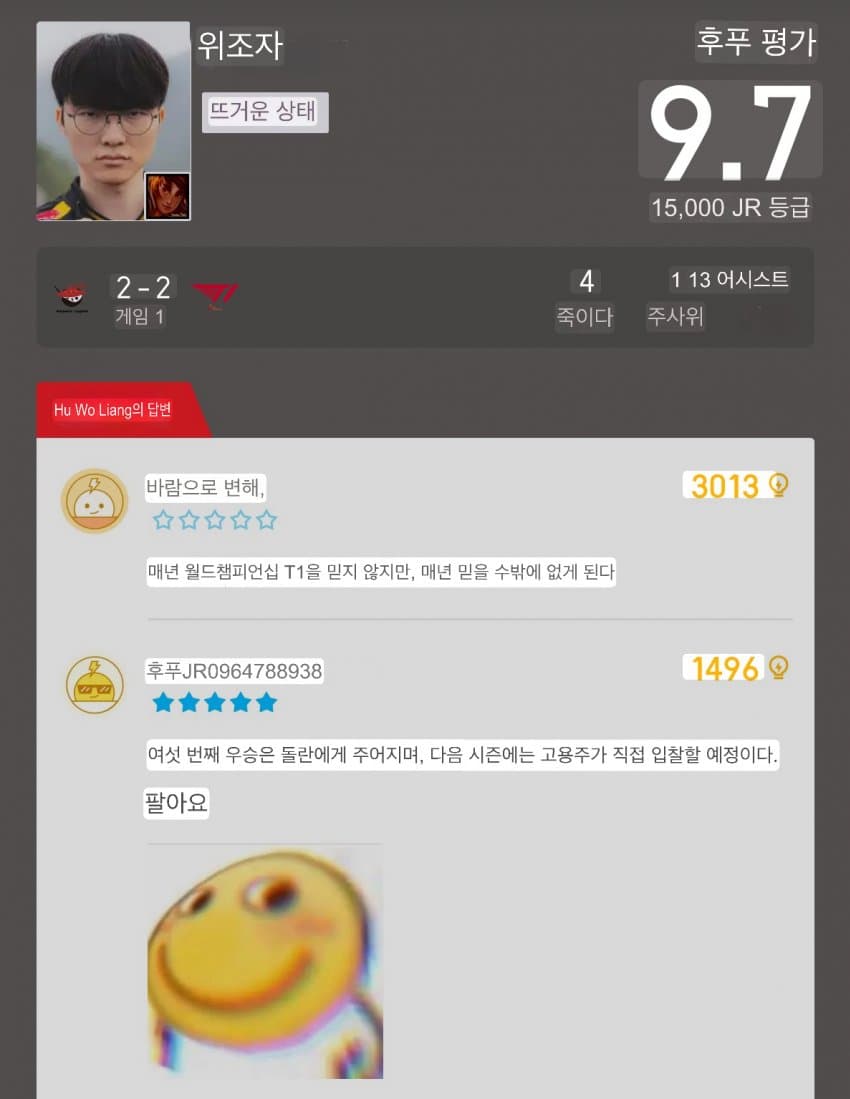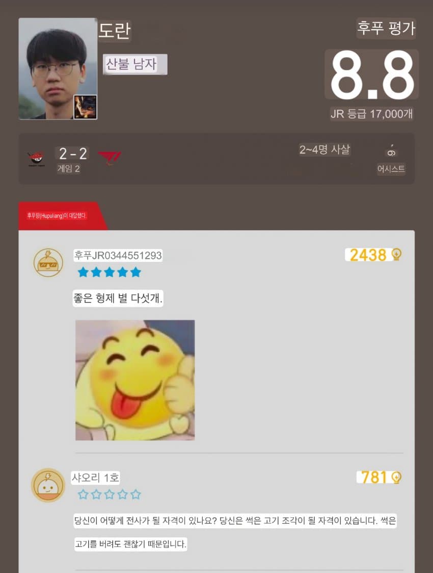 평점이랑 댓글 보니까 Shangus ← 임마 중국의 쵸비임? 월드 8강딱 하고도 미드는 잘했는데 하면서 빨리노 ㅋㅋㅋㅋㅋㅋ