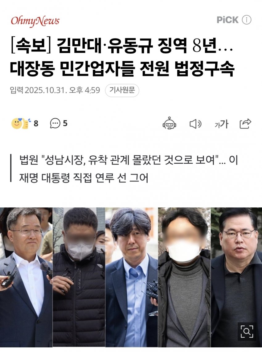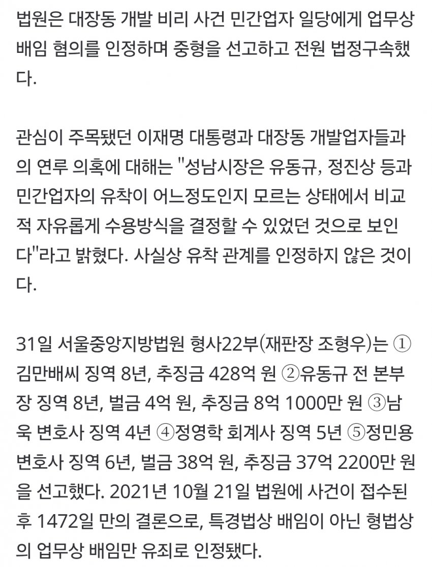팩트는 법원이 판결문에 이재명 관여를 시사함 ㅋㅋ오마이뉴스같은 찌라시 말고 메이저 언론들은 그렇게 보도하고 있음 ㅋㅋ“유동규, 수뇌부 결정 조율 담당”…법원, 이 대통령 관여 시사재판부는 법정에서 가급적 이 대통령 실명을 언급하진 않았다. 대신 ‘수뇌부’ ‘성남시장’ 등 표현으로 연결 고리를 시사했다. 유 전 본부장에게 “대장동 사업 관련 주요 사항 모두를 단독 결정할 수 있는 위치에 있지는 않았고, 성남시 수뇌부가 주요 결정을 하는 데 있어 민간업자들과 의견을 조율하는 등 중간관리자의 역할을 주로 담당했다”고 말한 게 대표적이다