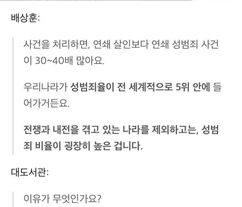 성범죄에 대한 범주를 너무 넓게 잡아서 그럼. 강간, 아동 성폭행 같이 중대한 범죄와 성인지 감수성 부족, 세대 차이로 인한 인식의 격차로 발생된 성희롱, 남녀 간에 발생한 범죄 등 모든 것들을 그냥 성범죄로 종합해서 치부를 해버리니까. 성범죄에 대한 비중이 극단적으로 높아지는 거지. 특히 화자의 의도와 상관없이 실수로 인해 발생한 문제를 극단적으로 부풀려서 범죄화 시키는 건 나는 솔직히 경찰의 실적 쌓기 방안이 아닌가 싶음. 인터넷 관련된 통매음, 모욕죄 같은 경우도 변호사들 돈 벌게 해주려고 만들기 위해서 제도화 한 것 아닌가 싶음. 우리나라는 사람들이 예민해서 그런지 법적으로 너무 디테일한 부분까지 가려서 좀 많이 피곤함