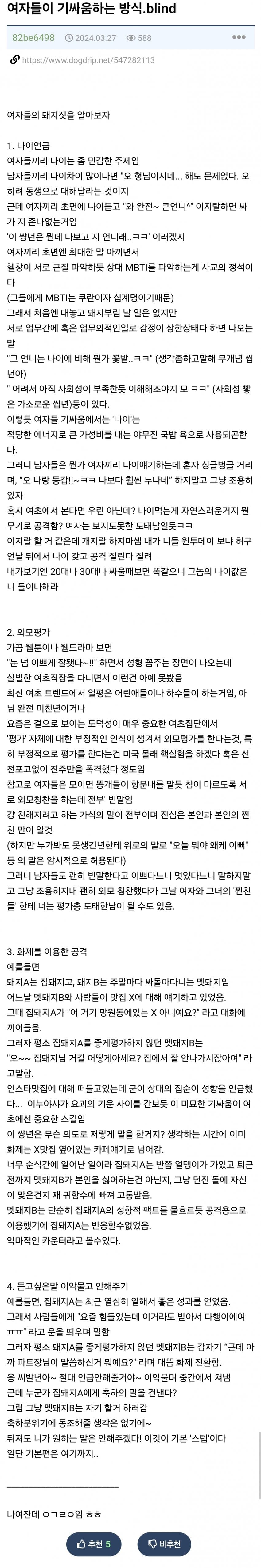 기집애들한테 뒷욕 수동공격 정치질 사람 평가질은 그냥 스포츠고 게임임 남자들이 풋살 뛰거나 롤하는거랑 다를게 없는 짓인거. 나는솔로 같은거 보면서 욕하는년들도 일종의 롤드컵 보면서 분석하는거랑 비슷한짓 하는거임