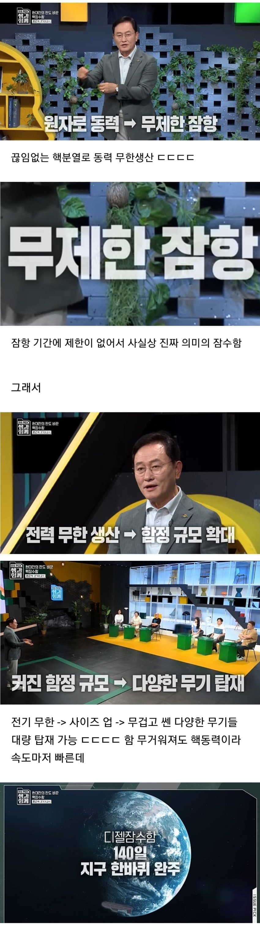 핵잠수함의 진짜 의미는 고농도의 핵연료를 사용한다는거 핵폭탄 만드는데 제일 시간 걸리고 몰래 만들기 힘든데 고농도 핵물질인데 그걸 응 연료야 하고 당당하고 가질수 있다는것임 ㅋ