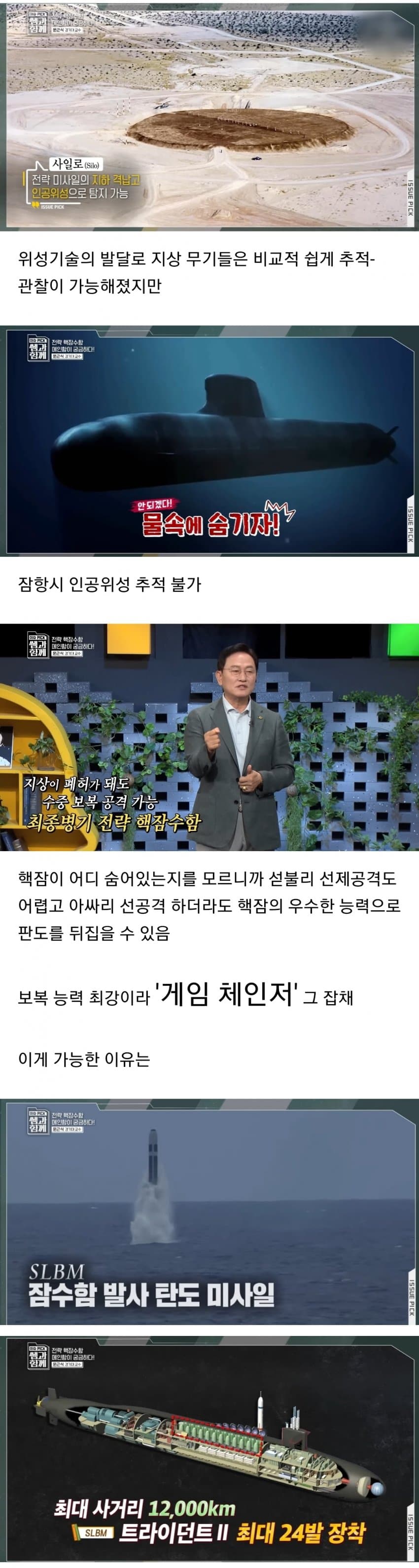 근데 미국 같이 땅이 넓어서 핵 잠수함 올라올때 위치 그래도 어느정도 숨기기 가능할거 같은데 한국은 너무 좁아서 올라올 때마다 그때 그때 위치 특정되어 버릴거 같은데 물론 몇달간 잠항할때 위치 모르는게 중요하지만그리고 지금도 잠수함 탈 사람 없는데 몇달 동안 잠수함 타라하면 탈 사람이 있나