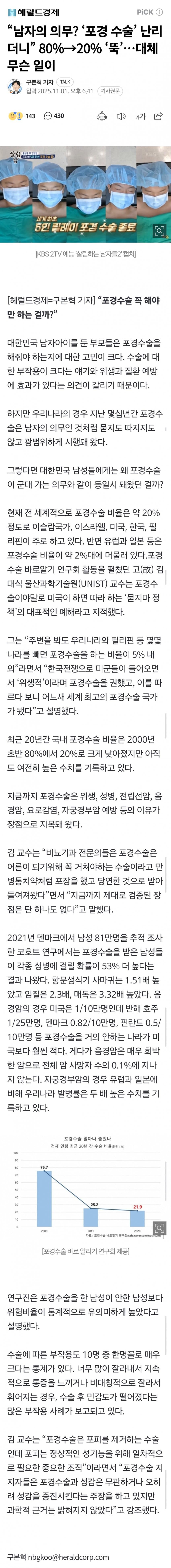 위생 이런문제도 있지만 포경수술은 기본적으로 병을 치료하는거임 포피부분이 꽉물려서 소변도못보고 발기도 제한되는 상태가 있음 이걸 포경이라고하고 이걸 미리 하는건 예방적 조치라고도 할수있지 80%나 할필요는없지만 너무 포경수술이라는 단어자체를 반대하진마라 꽤 높은비율로 존재하니까