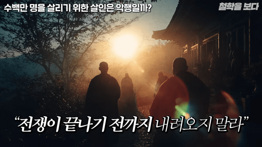 대의를 위한거니 계율위반이 아니다라는 합리화 대신 그냥 카르마 질 사람은 남고 나머지는 계율 지키러 숨어라라는게 좀 멋있음