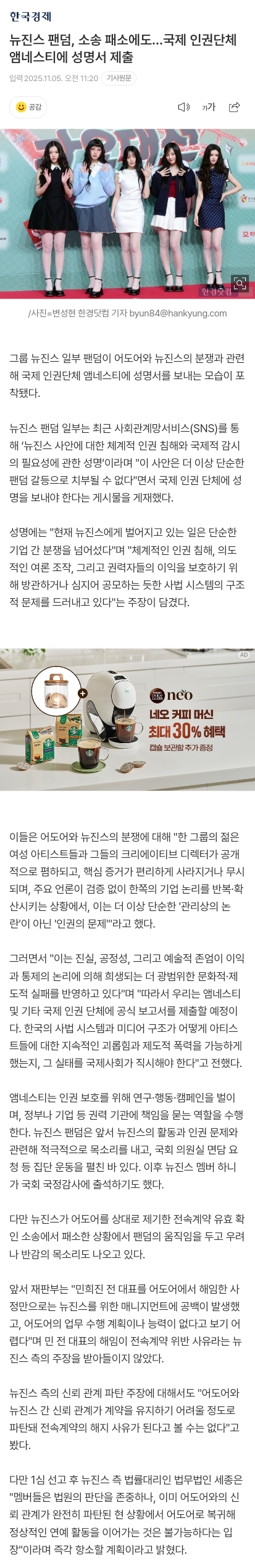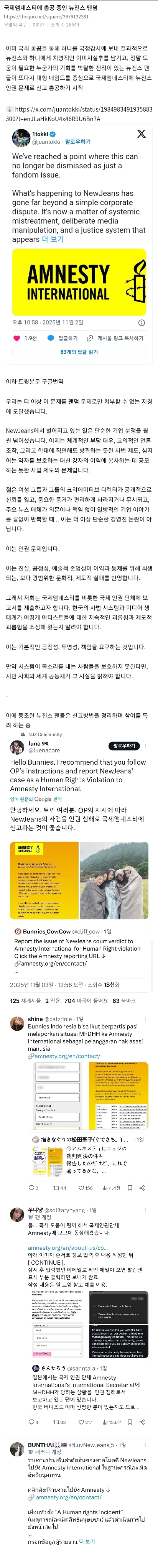 뉴진스 팬덤, 소송 패소에도…국제 인권단체 앰네스티에 성명서 제출