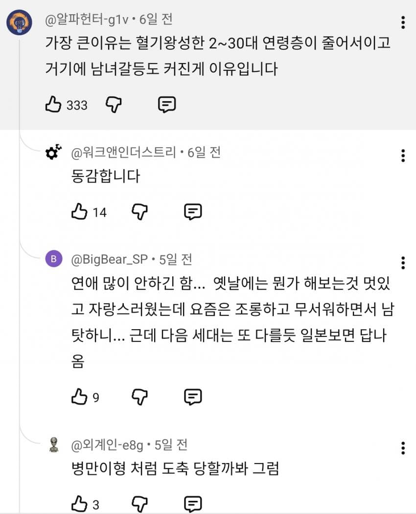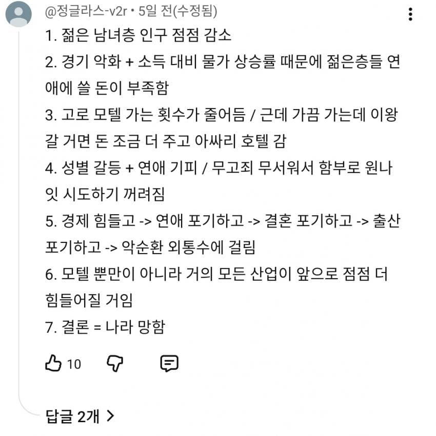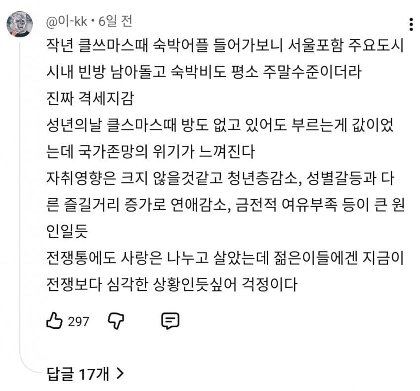경기 안좋은건 큰문제아님 나라부터가 남녀갈등부추겨서 연애안하는게 젤큰이유지 경기는 무한도전할때도 경기불황 경기불황 노래불렀음 옛날개콘봐도 개그맨들이 경기불황으로 개그쳤고