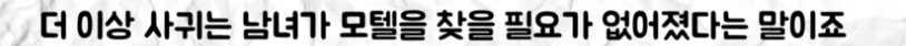 성범죄 전과자 될까봐 처음 만나는 사이면 모텔 절대 안감어느정도 사귀는 사이가 되면 대실도 돈아깝다고 그냥 자기집에서 섹스함성범죄자로 고소당할까봐 원나잇이 급감한게 가장 큰 원인임