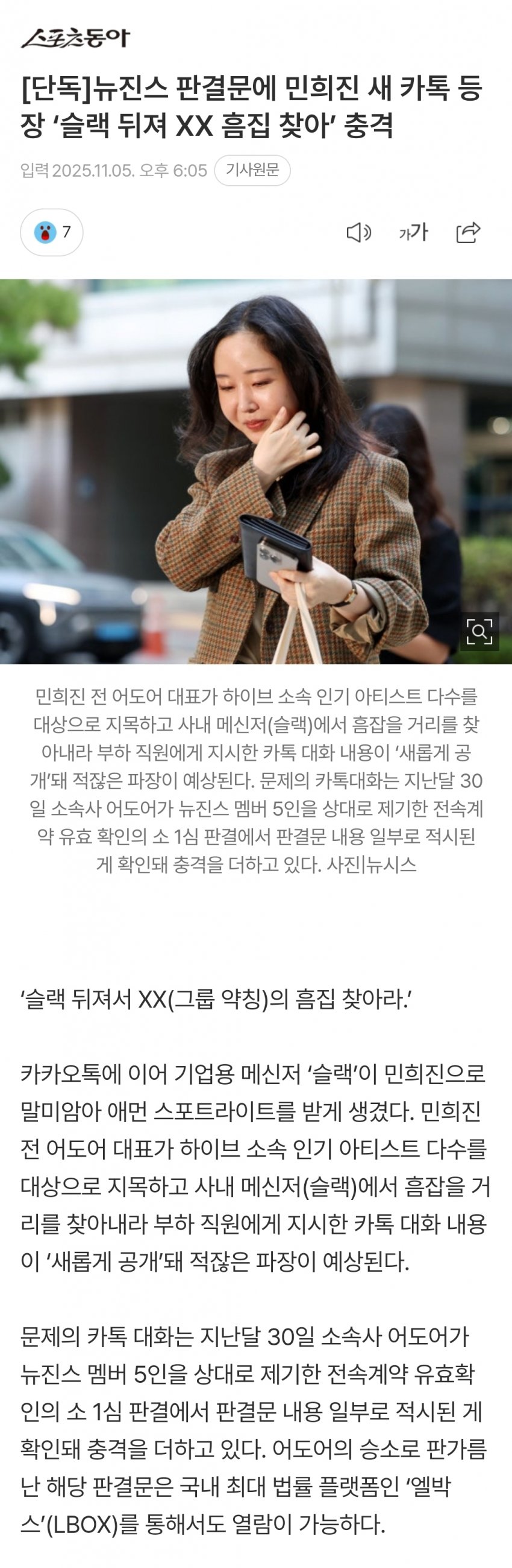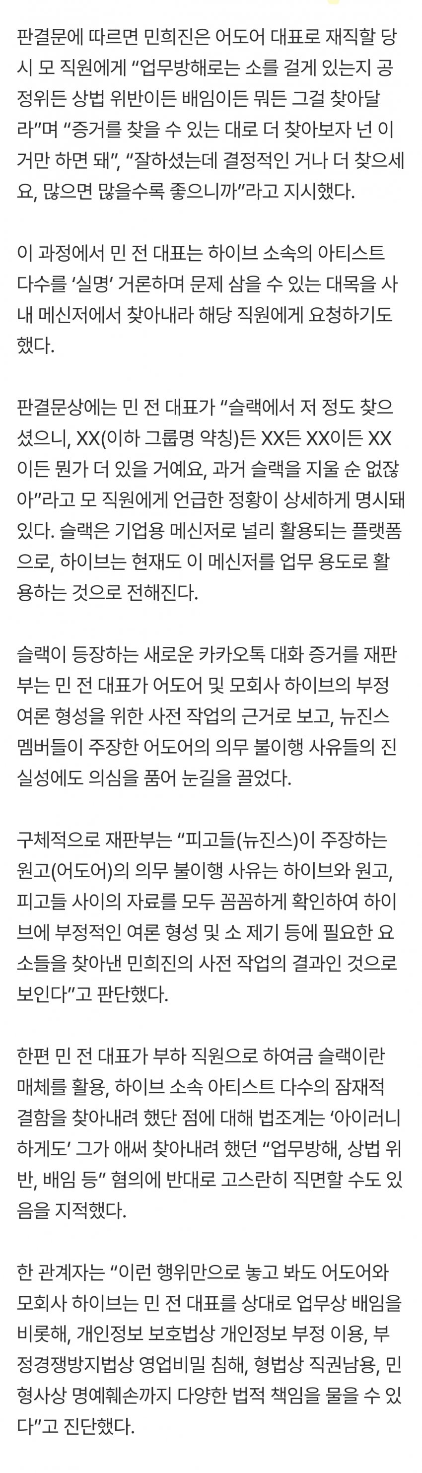 @ㅇㅇ(218.153)당연히 무조건 민희진 편들고 하이브가 잘못된거라 믿으니까 판결이 설득력없다 주장하는거지. 제발 정치병자 같은 헛소리는 하지말고.. 이번 뉴진스 소송 판결만 잘 읽어보고 거기에 나온 카톡이랑 슬랙, 민희진이 지시한 여론전 내용이나 보고와라. 그게 맞나.. 애초에 어도어가 하이브 소유라는것도 모르는 능지니까 헛소리만 해대지.