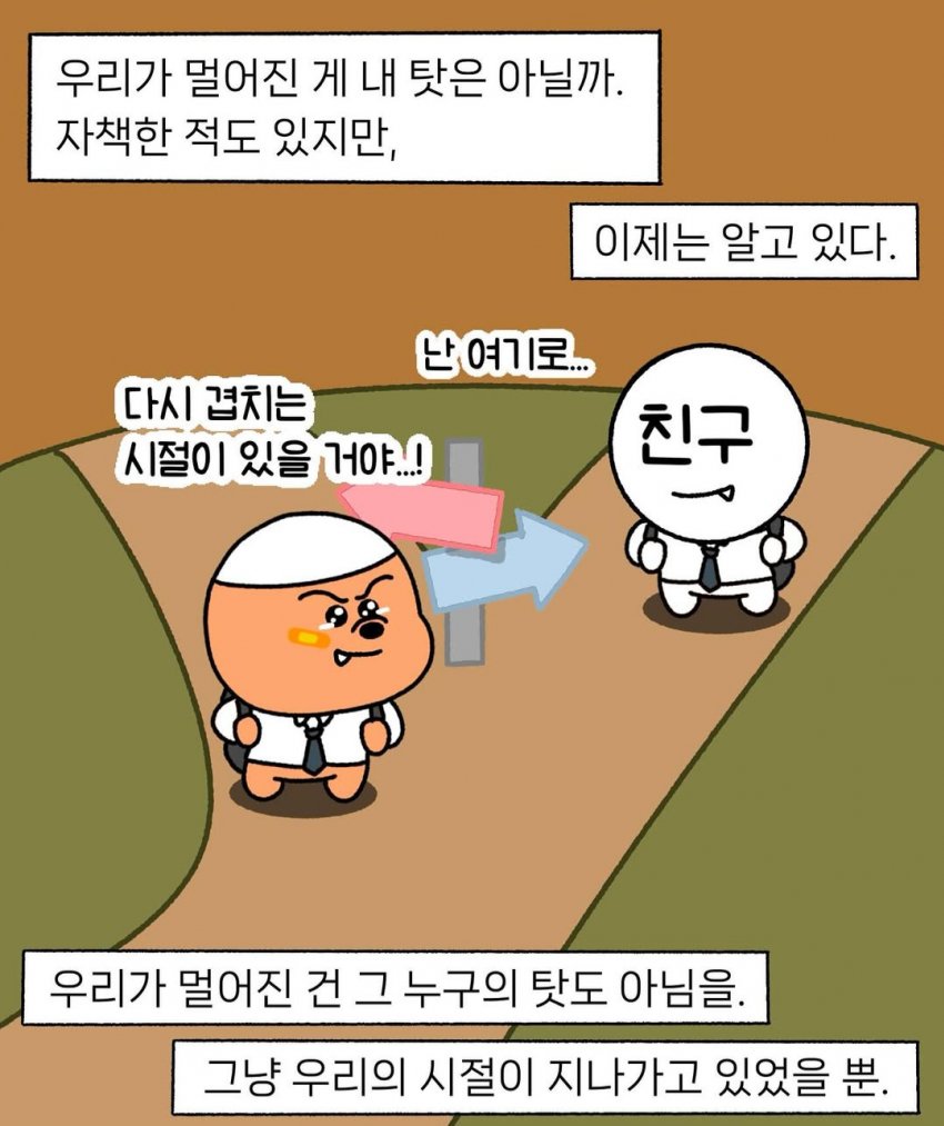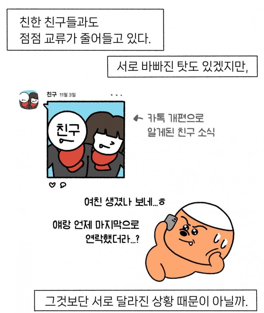 난 애들 군대 가있는 동안 수능 삼수했고, 애들 돌아올쯤엔 내가 입대 했더니 전역했을 땐 이미 다 자기 자리들 잡은거야 대학생활 친구들, 알바 친구들이랑 이미 잘 지내고 있는거같고... 예전처럼 지내기에 너무 삶이 달라졌구나 싶어서 그때부터 혼자 지냄..