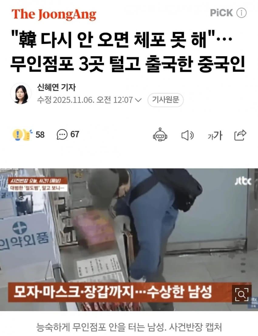 "韓 다시 안 오면 체포 못 해"…무인점포 3곳 털고 출국한 중국인