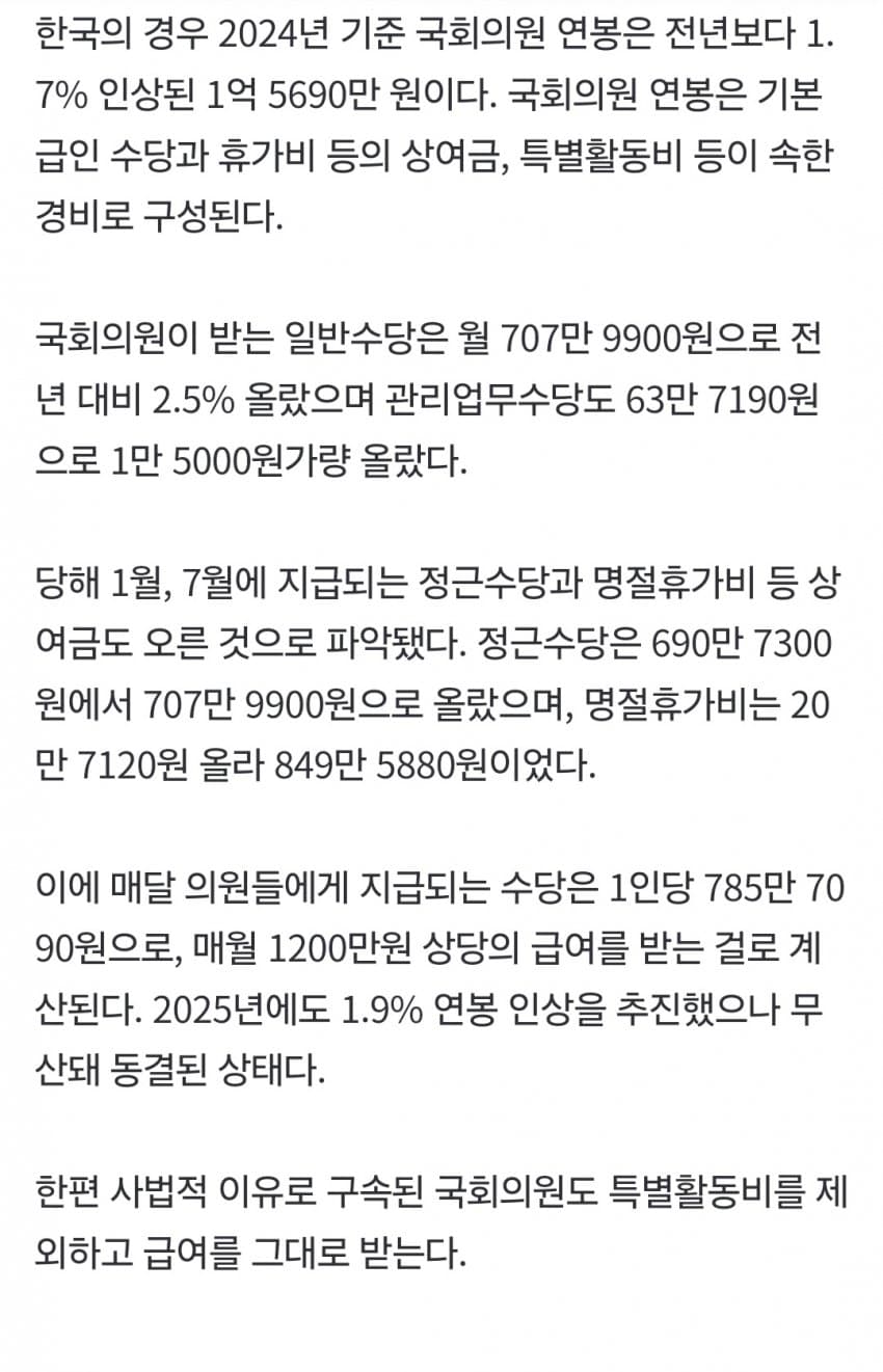 국회의원 연봉 1억 5천이면 한달에 국회의원이 세금떼고 약 800만원 정도 받는건데 5년 임기로 월 800이면 너무 적어서 임기 중에 뇌물 받게 되지 일본 한국 둘다 국회의원 월급이 너무 적은 편인데 개돼지들이 많다고 생각하는거임