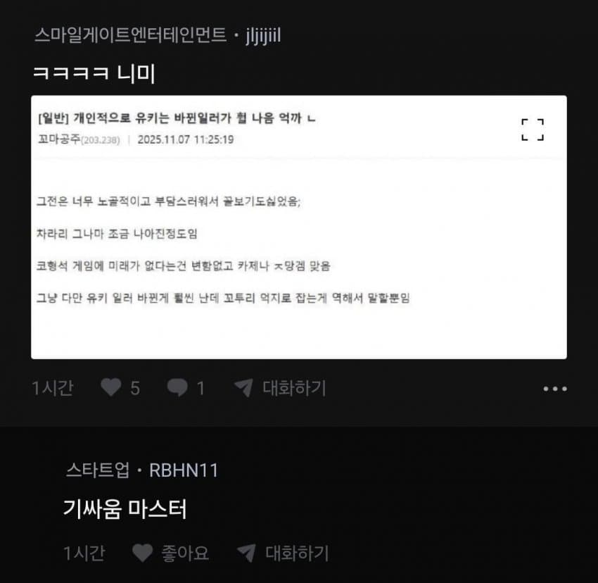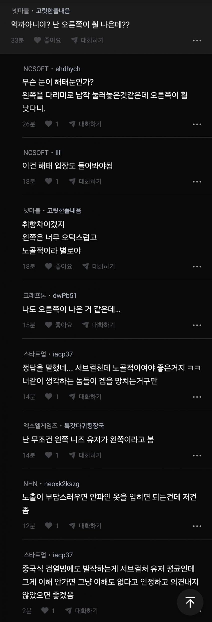나도 왼쪽은 김형태 스럽다에 공감…물론 그게 좋은 거임ㅋㅋ 나도 게임회사 다니는데 요즘 영포티 시니어&여자 동료들이랑 얘기하다보면 이 집단 시장을 이해하려는 노력이 부족함. 일 많아서 바쁜건 알겠는데 팔아야되는 소비자 분석은 똑바로 안하고 “이정도면 좋아하는거 아닌가?”라는 생각으로 접근함ㅋㅋ 그러니 니맛도 내맛도 아닌 게임이 계속 나오지