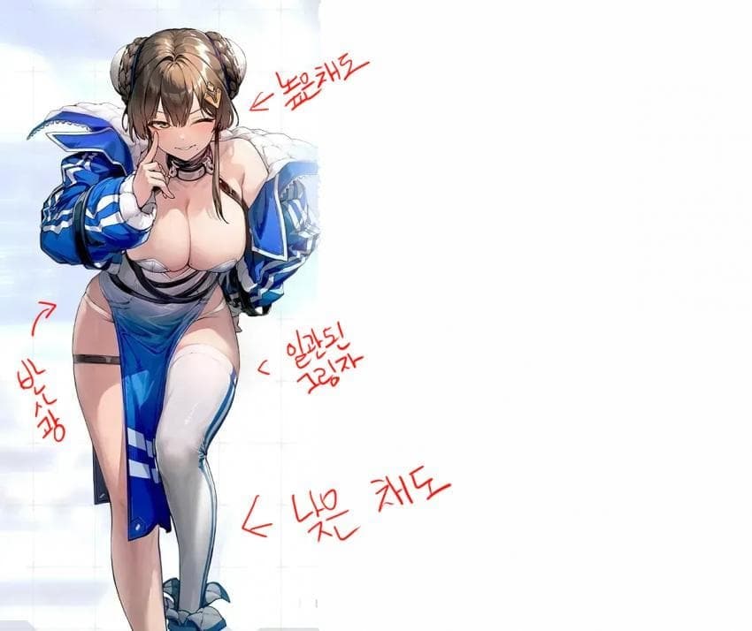 채도 어쩌구 빛이 어쩌구 다 그냥 뜬구름 그냥 공허한거임왼쪽 잘 그렸음 구도 좋고오른쪽 약간 라이트 받는 부분 톤다운 머리 피부 대비가 낮아졌다고 해야하나? 유추해보면스타일 일수 잇고 겜상에 올려지는거니 약간 다른 일러랑 통일? 기존 라이트가 강하게 받은 느낌 다운시킴오른쪽 손 비율 머리 각도 다 나갔음 이것도 좋게 이해하자면 겜상에 올려 질꺼니 기본 비율이 나와야하는데 못나와서 늘렸을 수 있고근데 얼굴은 더 못 생겨짐 끝