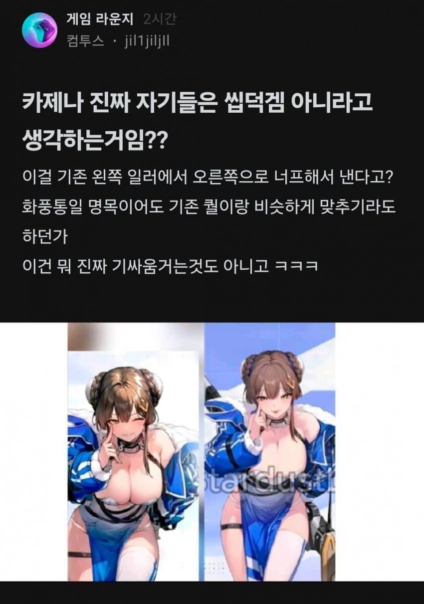 오른쪽 이쁘다고 하는 인간들 만약 본인이 게임 업계 입사 지원한 신입이라 치고 면접관이 짤 보여주면서 두개중에 뭐가 이쁘냐고 물어보면 닥 왼쪽 고를껄 ㅋㅋ
