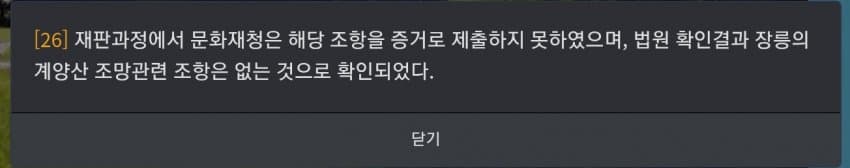 재판 중에서 해당 풍수지리가 유네스코 등록유산의 일부 조항으로써 들어가있다는 것을 증명하지 못했다.