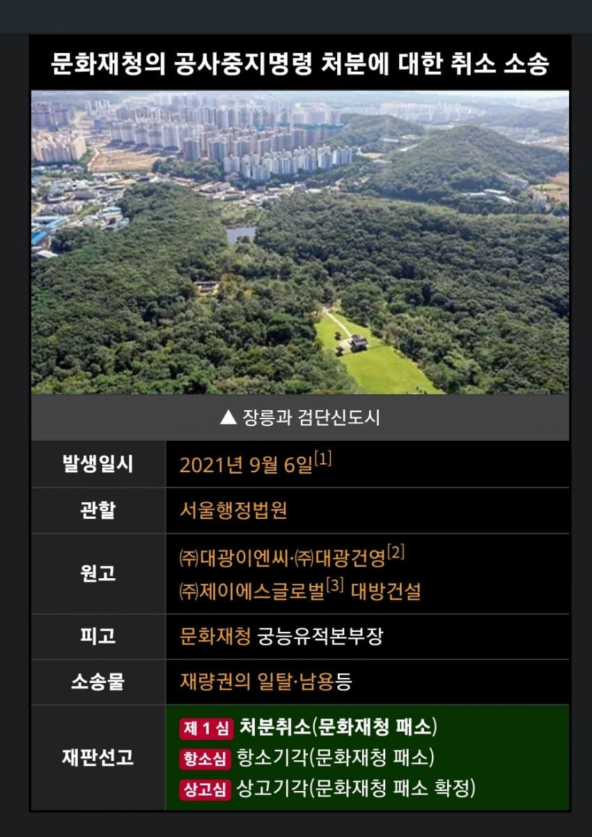 3기 신도시 사업을 하며 지어지고 있던 검단신도시 아파트가 왕릉의 뷰를 훼손한다며 문화재청이 소송을 걸었던 사건이다.