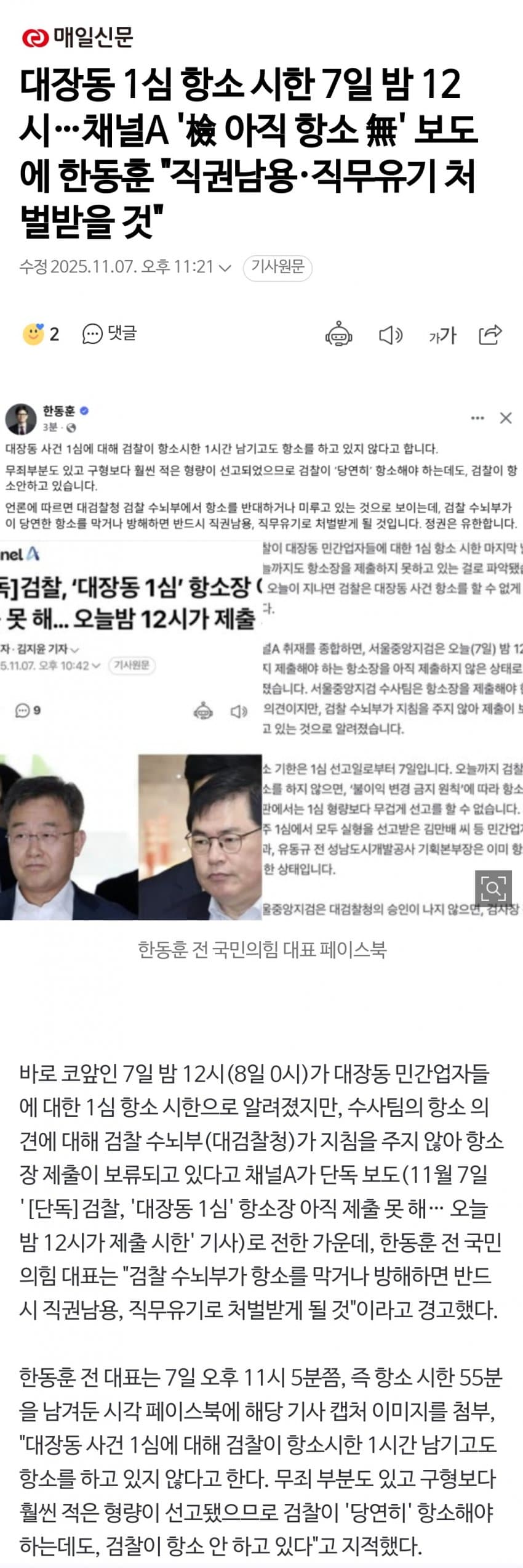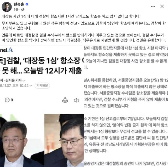 대장동 1심 항소시한 7일 밤 12시…한동훈 "직권남용·직무유기 처벌받