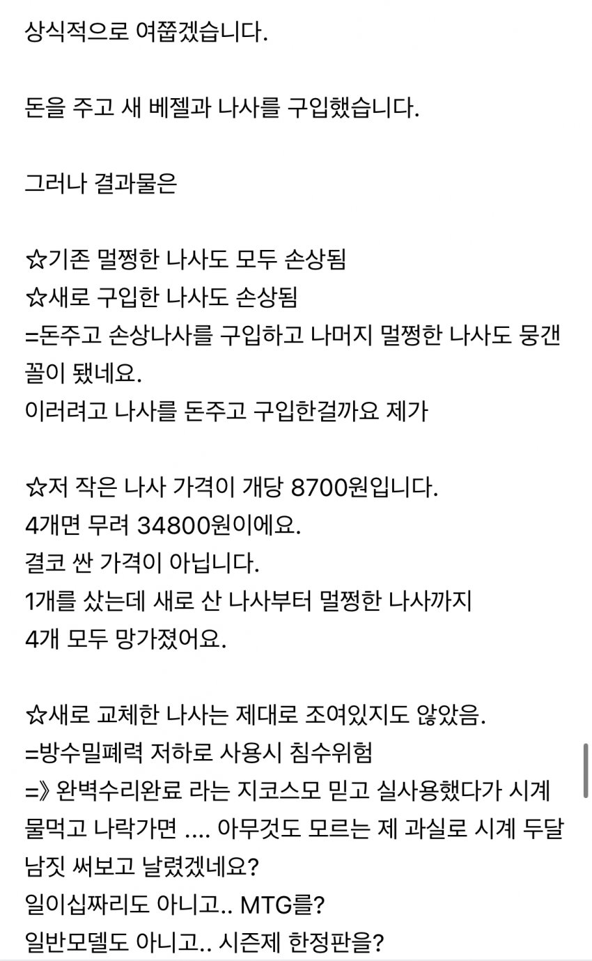 저런 거 나사는 쉽게 와샤 나갈 수 있어 조심조심 천천히 돌려야 하는데 전동공구로 그냥 임팩 쳤네. 싸구려도 아니고 저런 고가 제품 수리하는 사람도 일 저 따위로 하는구나. 저건 당연히 새로 AS 해줘야지. 아니면 저 회사 제품은 AS가 없다고 생각하라는 거랑 같은 거. 와 금액 보니 더 어처구니 없는데, 저 베젤이 30만원이 넘고 나사가 9천원인데 저 따구로 했다고? 헐 ㅋㅋㅋㅋ
