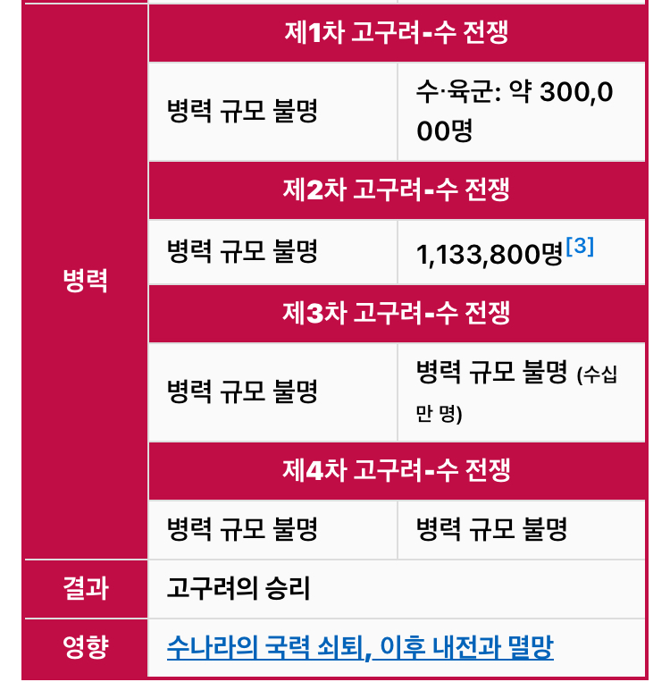 옛날 1되 1근 이런 단위가 지금이랑 기준 다르듯이.. 저때는 10000이 지금 100이다. 30만명 병력이라 하면 지금 단위로는 3000명임. 참고로 '되' 라는 단위가 있는데 현재 1.8리터인데 과거에는 30그램 50그램 이 정도라고 역사학자들이 추정함. 저거 인원도 중국 일본 한국 역사학자들이 추론해서 단위 다르다고 합의한 내용임